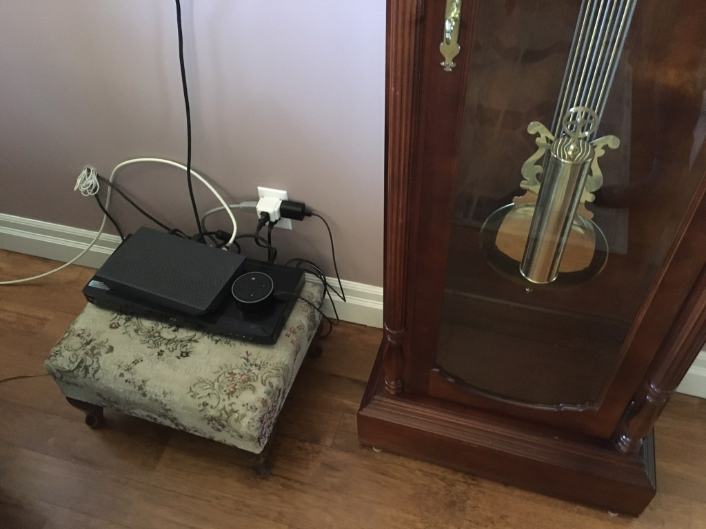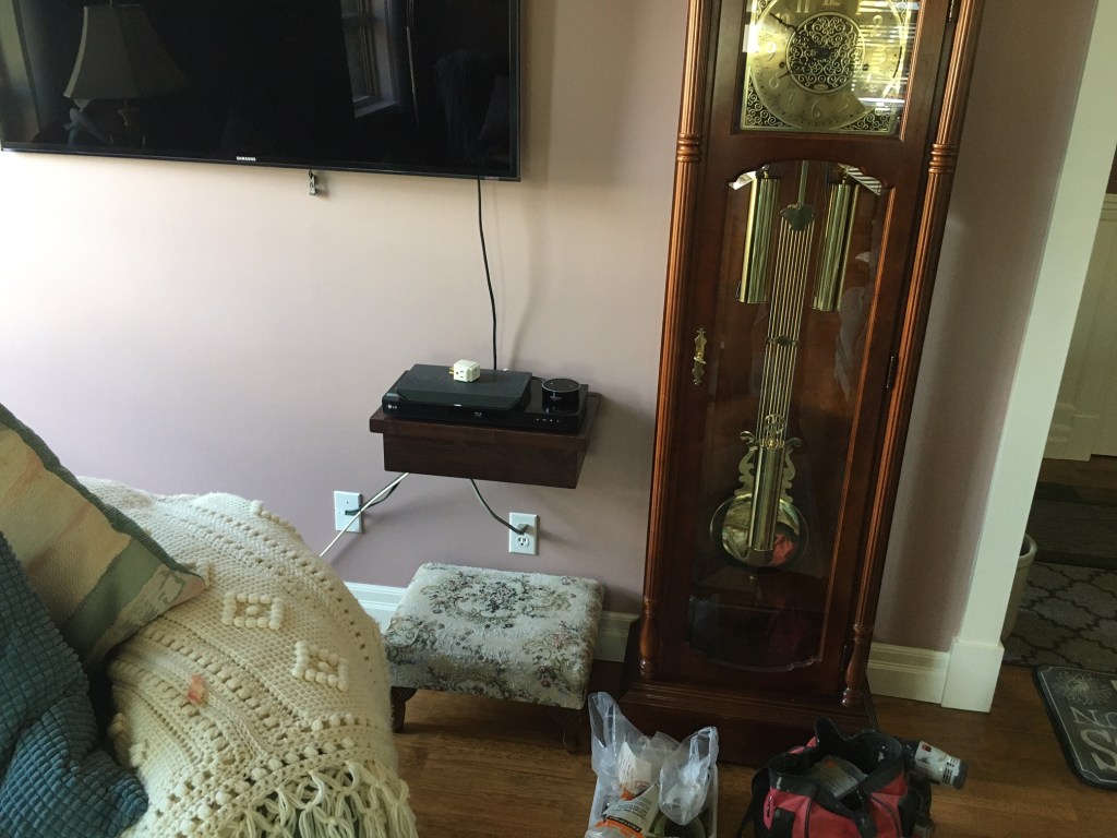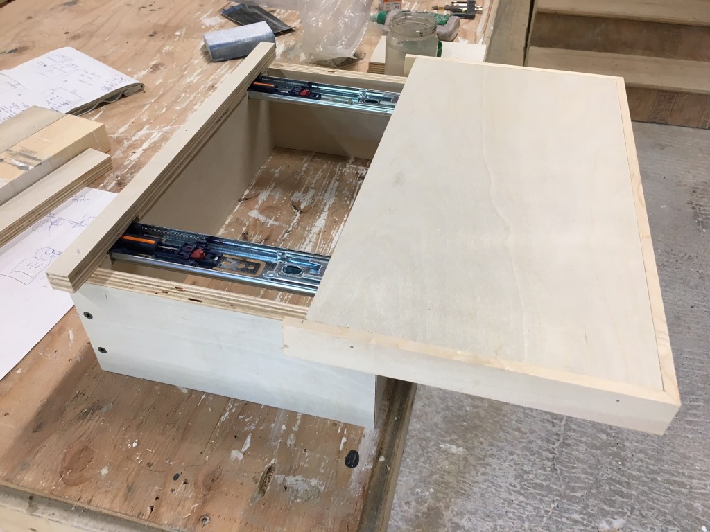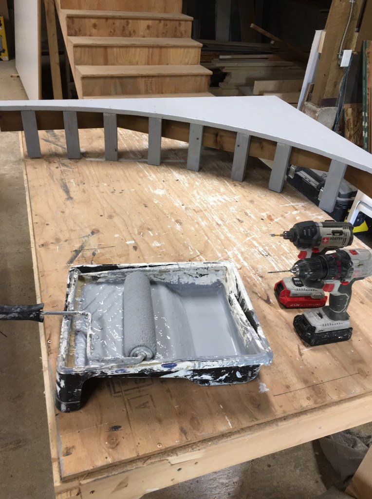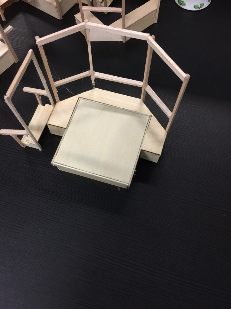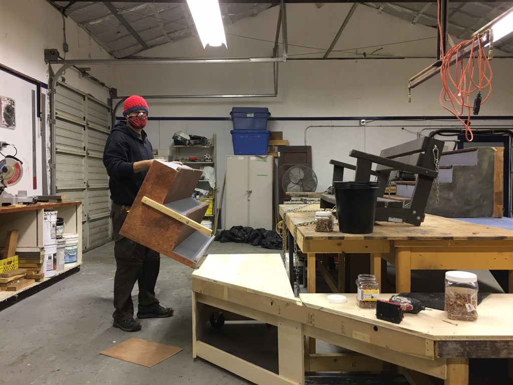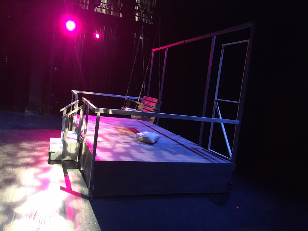 My director asked for a quiet snowfall during the scene where George is on the bridge, ready to live again. The venue (Abby Arts Centre) does have a soap flake snow machine, but it is noisy and wouldn’t work with the quietness of this scene. So I decided to make a snow cradle.