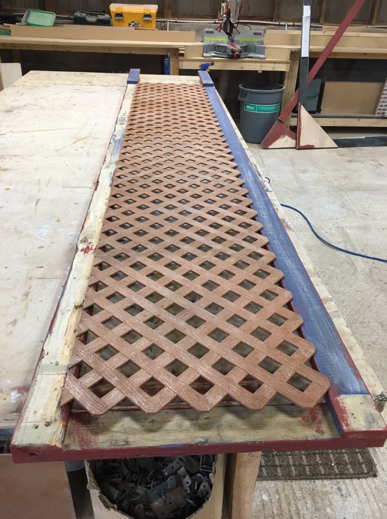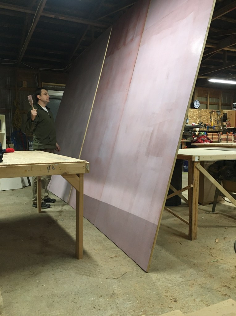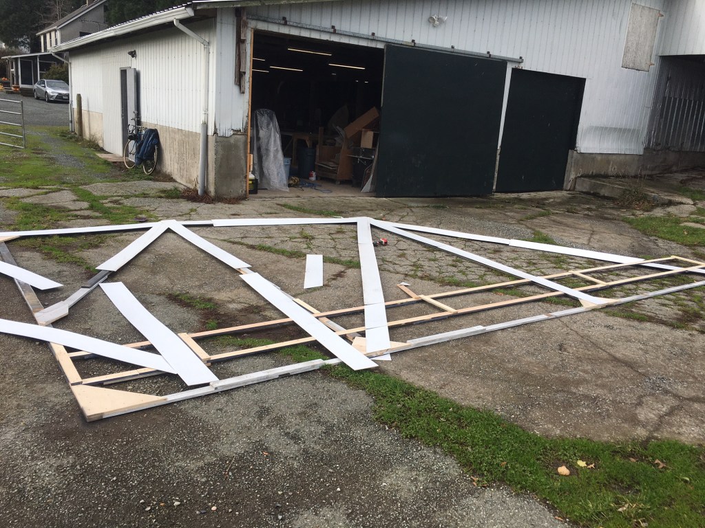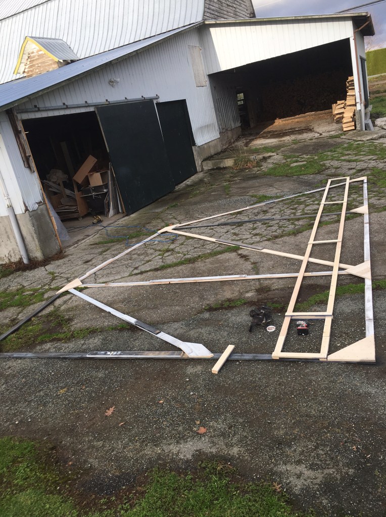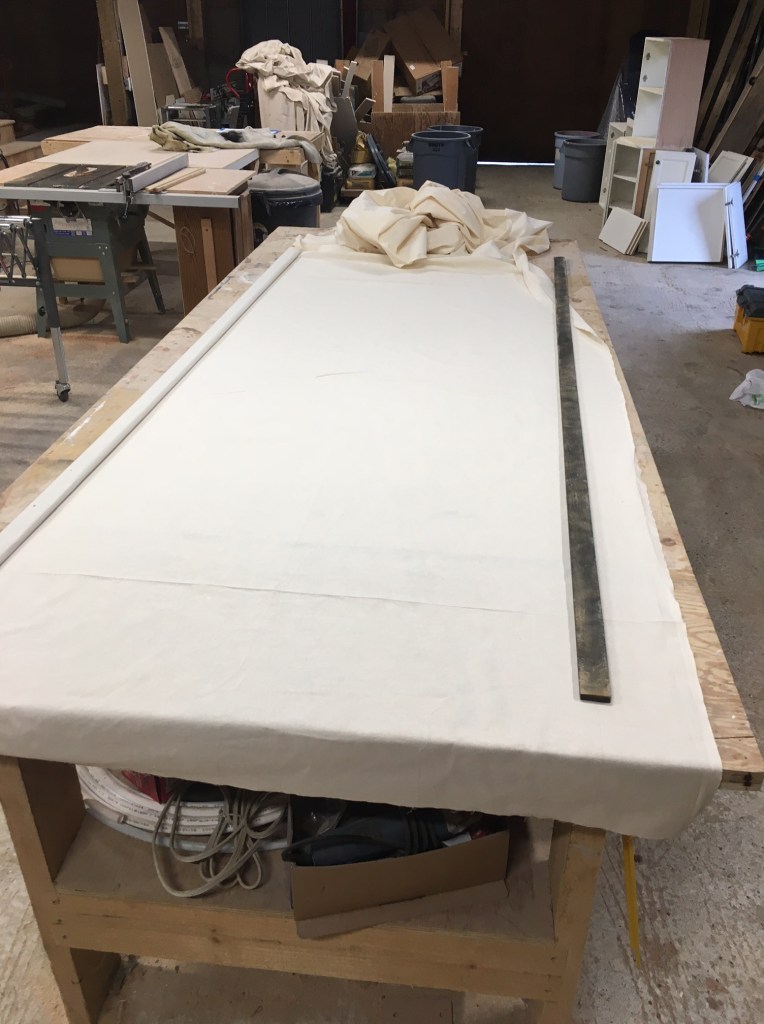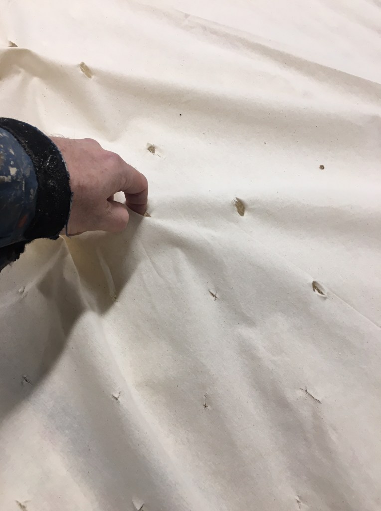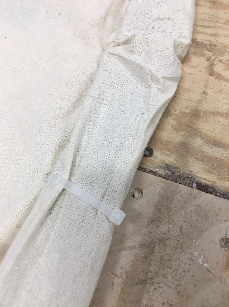 While researching snow cradles online, I found plenty of drawings (they all seemed to have the same source) but no practical photos. So things were a bit experimental. I bought 32 feet of 4-foot wide muslin. I then stapled thin sticks along the edges (sewing would be better but stapling is faster). This gives support for the edges so they don’t sag. Lastly I wrapped the sticks with zap straps every 4 feet so they could be attached to fly pipes easily later.