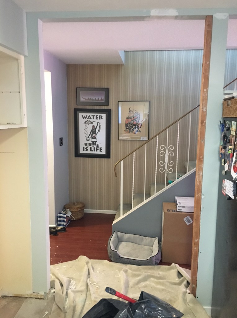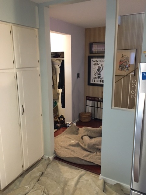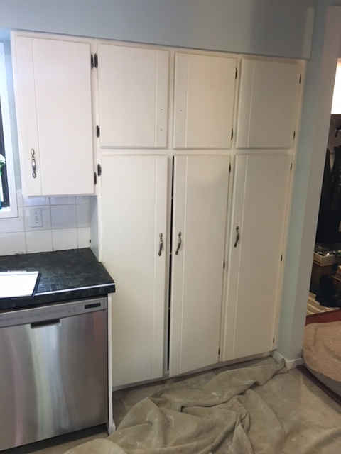 Hilary hired me to re-do part of her kitchen. To save space she wanted to remove a skinny, tall pantry and replace it with cabinets and countertop space. To do so, a wall had to move a little bit. New countertops and tile backsplash would finish it off.