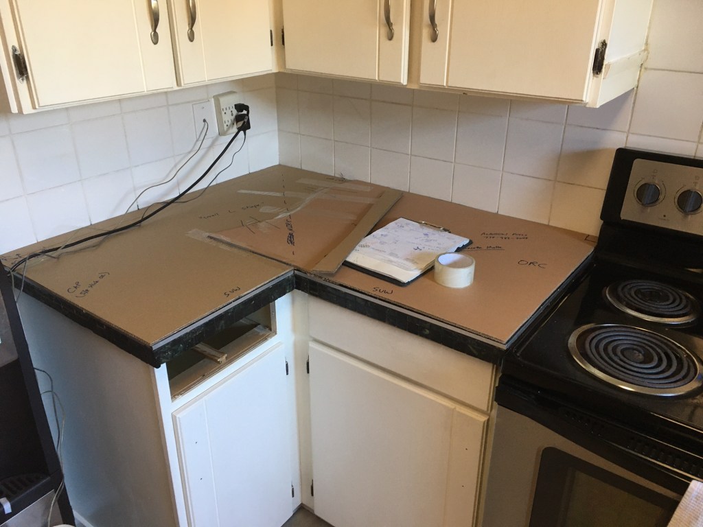 The old countertops were tile, which was overlaid over the original tops, which were “flatlay” (laminate), screwed to the cabinets from above.
