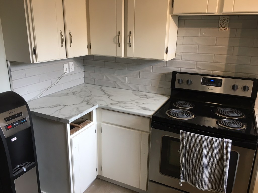 Pomi asked me to re-do the kitchen countertops in her rental house as they looked terrible and she was listing it for sale. There were 2 layers of laminate and the second layer was peeling off (and was not done properly). The edges had fallen off too and one had been fixed with tape.