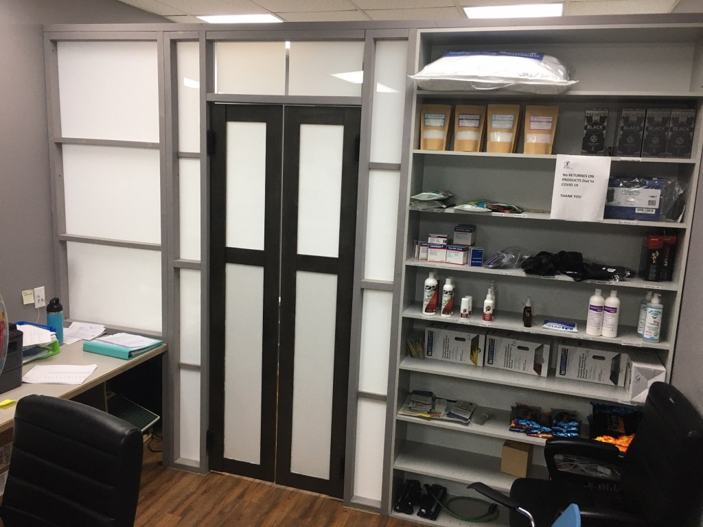 Get Well Physiotherapy hired me to divide the office/reception in half. Basically they wanted a private space behind the reception area. (We experimented with one-way (mirror) window film but it didn’t work too well, so went with frosted film.)