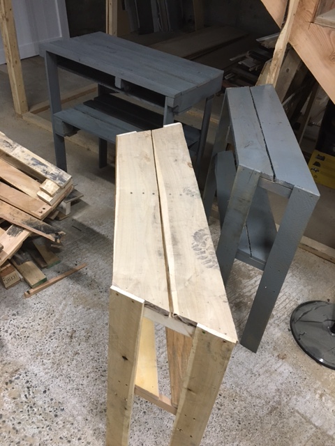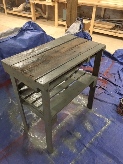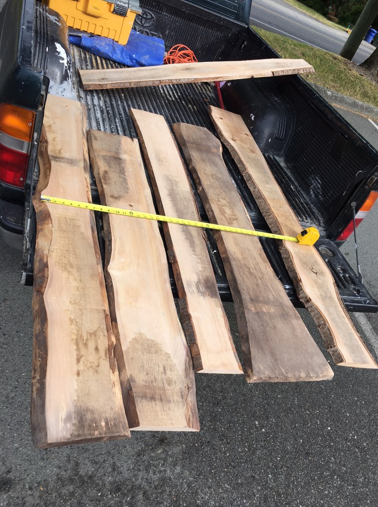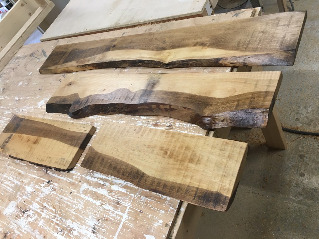 Then they needed a little more dressing up/contrast. So after planing off the back edge and sanding them a little bit, I cut them to size and applied stain to about half of each board. Then I varnished them, which unfortunately yellowed them a little, but they still looked good.