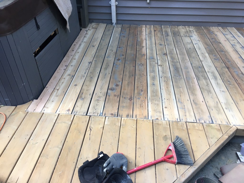 In the past I had sanded a deck and it had been easy. The only difference was that I had spent a day or two pressure washing and using stain stripper. At the time pressure washing seemed like a waste of time…maybe it wasn’t. I decided to try the stain stripper. It got a bunch of gunk off (a layer of stain?) but not all of it. I was back to sanding…