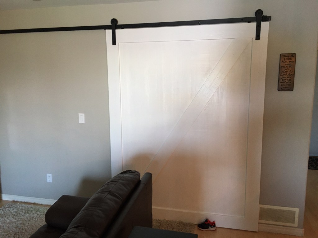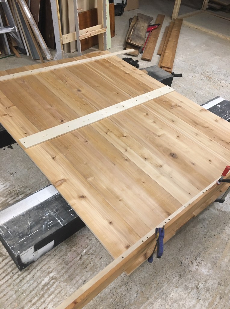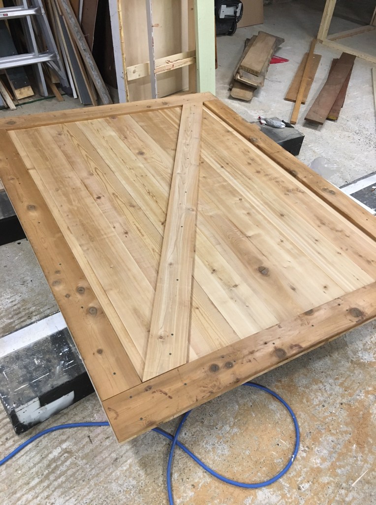 Misty hired me to make a barn door. She had some 1×8 cedar planks. I edged them and planed them before gluing them together, but as some weren’t perfectly straight there is a bit of a rustic feel. It is 7 feet high and 5 feet wide.