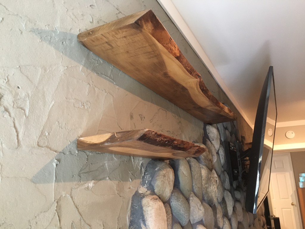 To install them as floating shelves on a concrete wall, I inserted 1/4″ lag bolts into the wall, cut off the heads, drilled matching holes in the back of the shelves, and slid them onto the bolts. I put a bead of silicone along the back too.