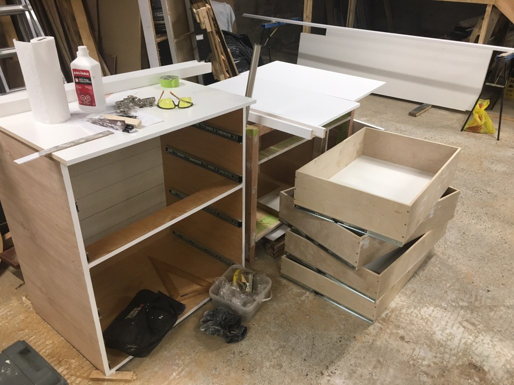 It took me a couple of days to build it and paint it, and half a day to install everything. To save time and material on the upper cabinet, I built the upper part “on site” using the side panels and interior shelves to hold everything together. But the bottom section was a pre-made plywood drawer box.