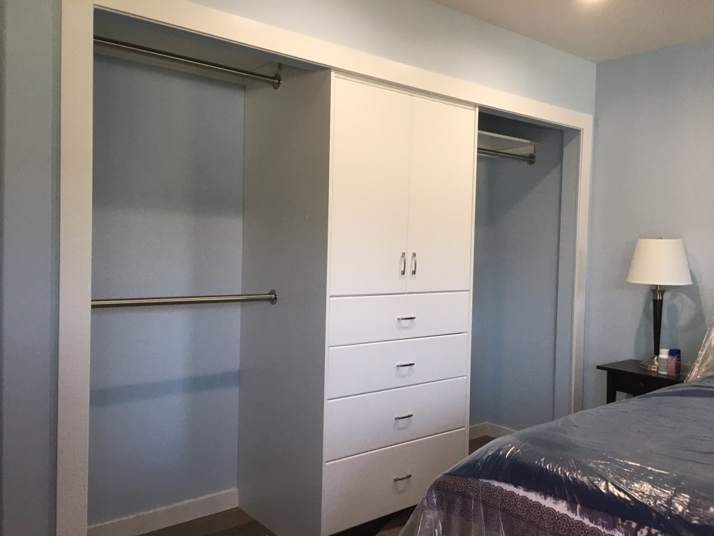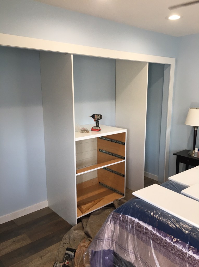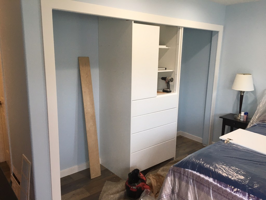She wanted it centered so that a couple of barn doors can be added in the future. So there is a 3 foot wide cabinet with a 3 foot wide space on either side. She also wanted shelves inside right up to the ceiling. And of course some rails for hangers.