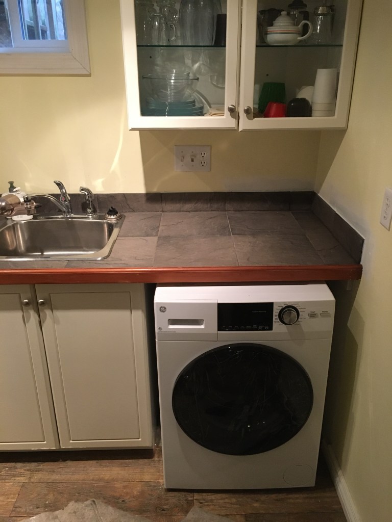 Debbie bought a cool washer/dryer combo for her suite; it washes AND dries the clothes in one little place. She needed to remove part of her tile countertop so that the plumber could access the wall behind and move some pipes around. There was also a cabinet to remove.