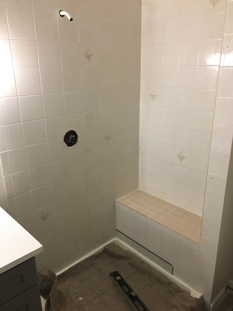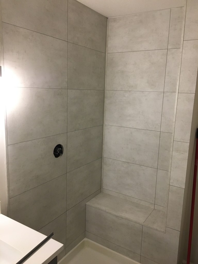 The shower was harder – but only because it had more corners (ie. the bench) and everything had to be levelled so carefully. That is the one issue I can see for DIYers–getting an area like this level. There is not much forgiveness with the 1/16″ gap between tiles–if you are out even an eighth of an inch, it will be very obvious by the time you get to the top of the shower! I put a bead of silicone behind the joints where there would be more water…and made sure to seal all the corners later as well.