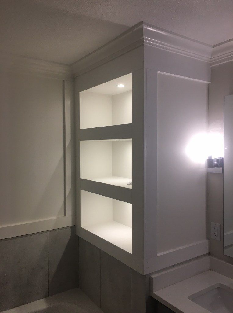The panel, however, cut out some light so the bath area became darker. An electrician installed some pot lights in the shelf…it does help a bit. Finished off with more mouldings; and Tom will give it the final coat of paint!