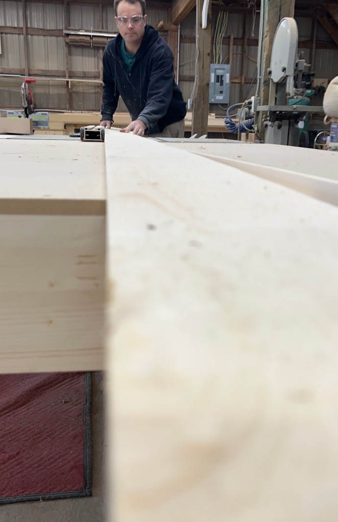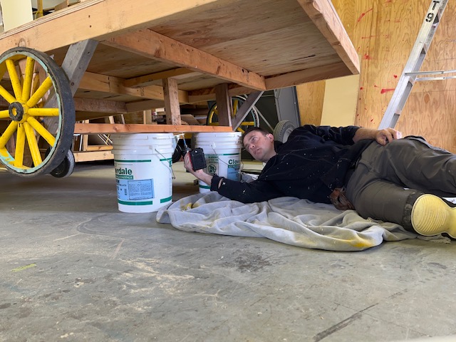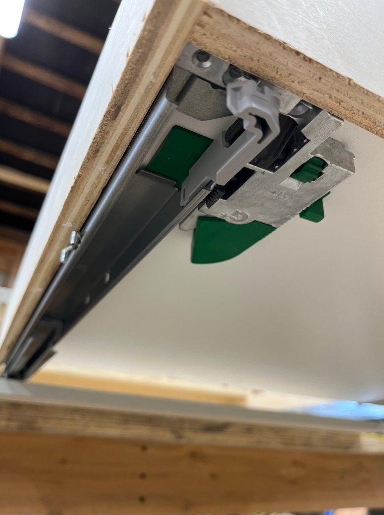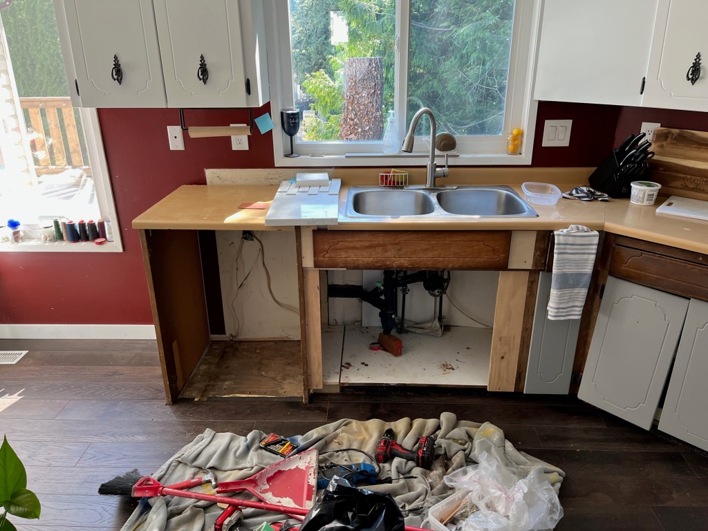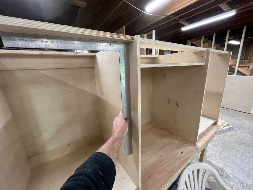 Before we started on the lower cabinets, Pomi had to choose a countertop, and a sink. She wanted to move the sink to center on the window, which meant getting out the cabinet stretcher and adding a few inches to the left of the cabinet.