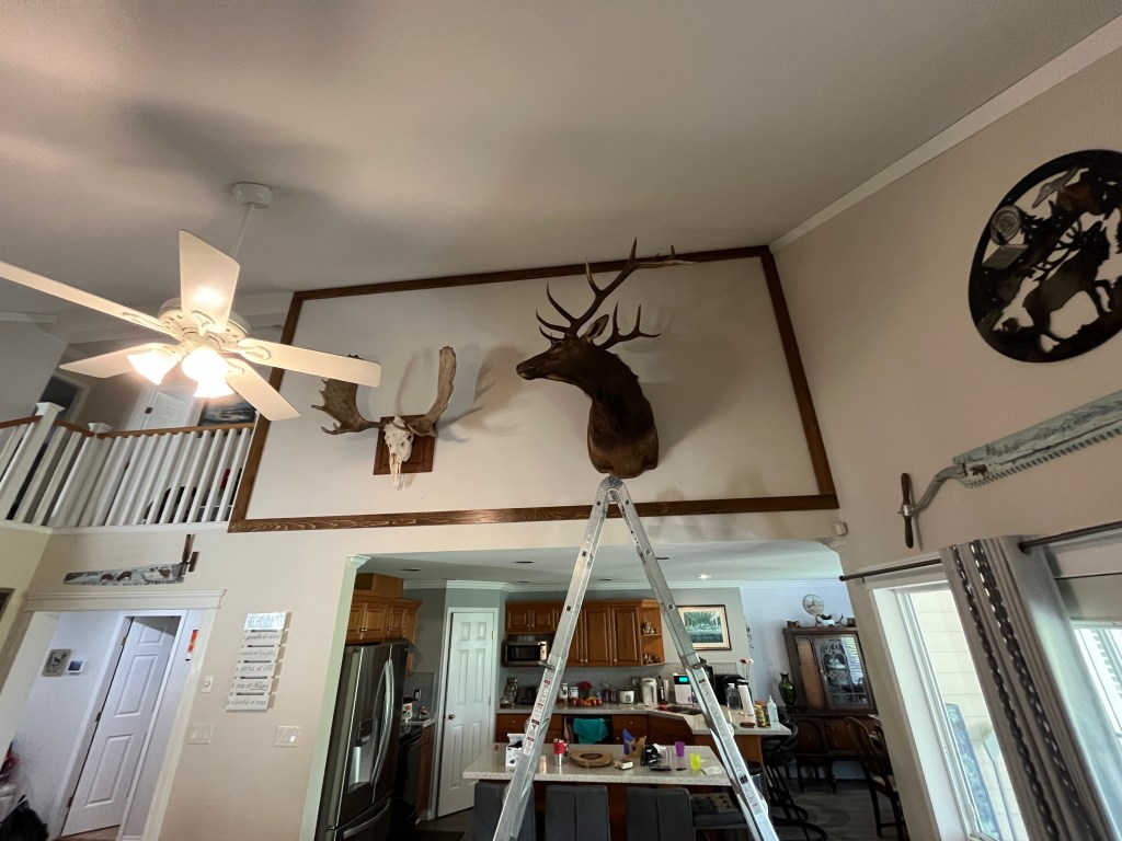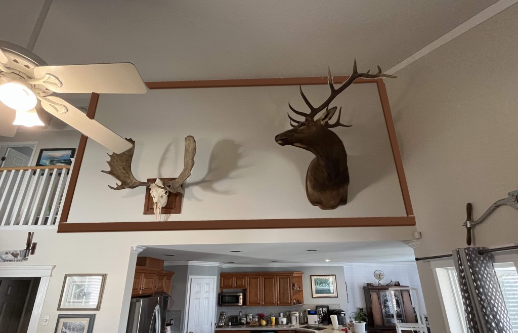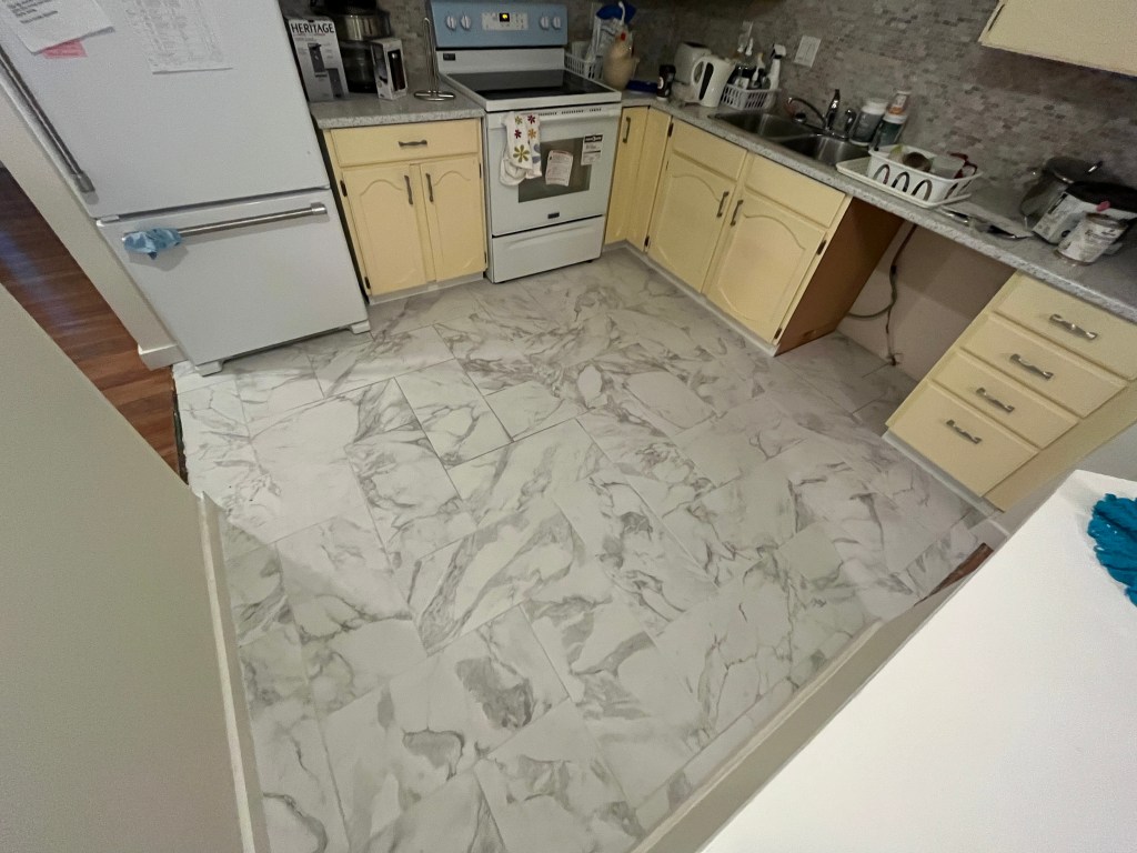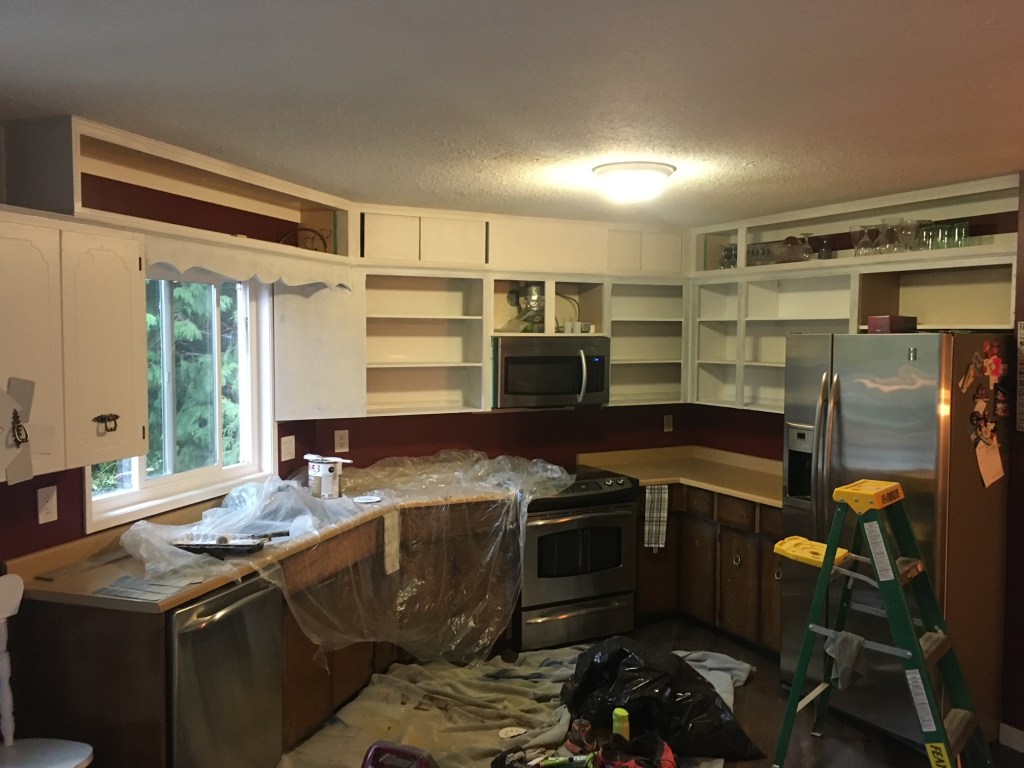 The old cabinets were in decent shape but a few hinges were bent, and the finish had worn over many years. I fixed the missing cabinet over the fridge and ‘added’ to the one beside the sink. Then I took off the upper cabinet doors and painted inside the upper cabinets.