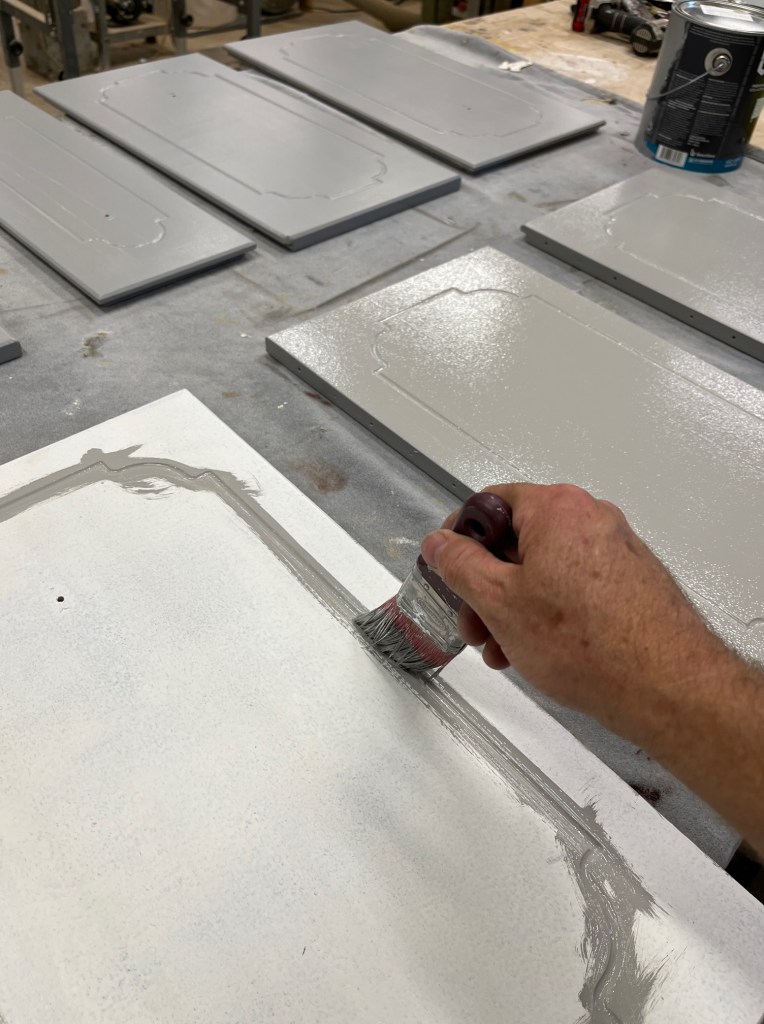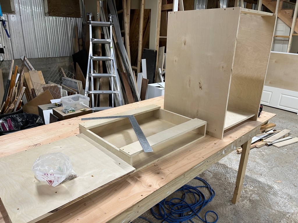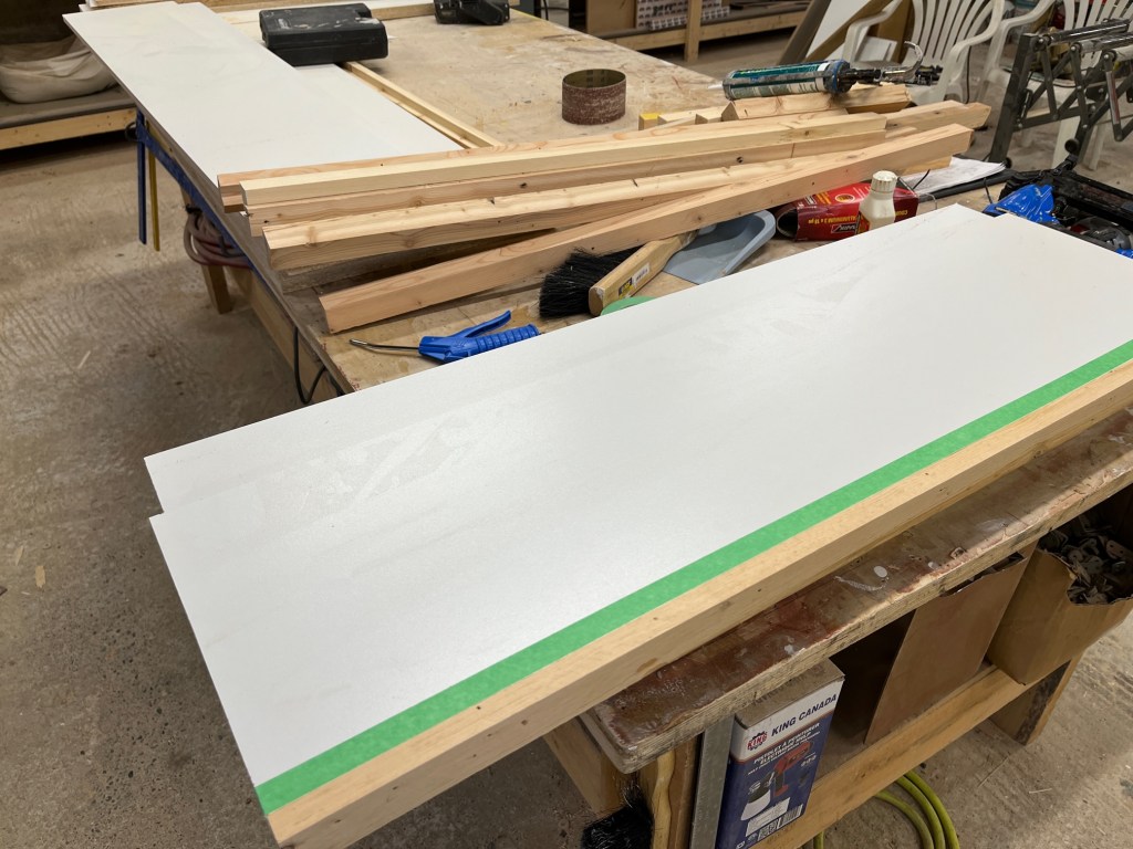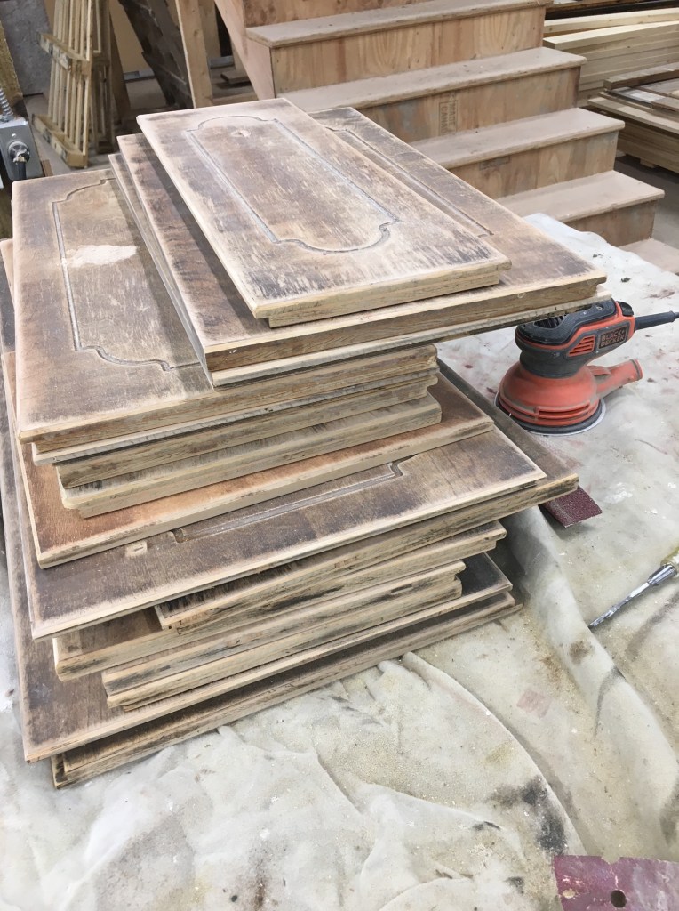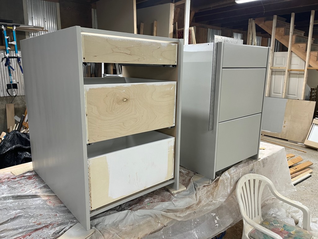 Then I sanded the doors and started painting them. I sprayed them with cabinet paint. I also made some sliding drawers for the lower cabinets.