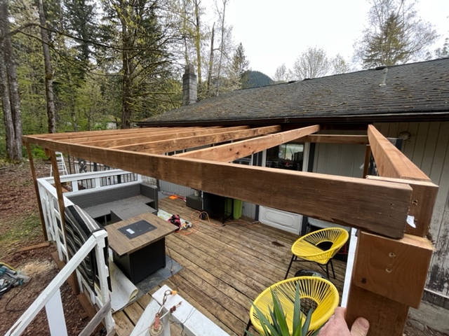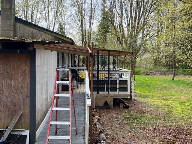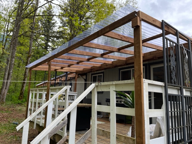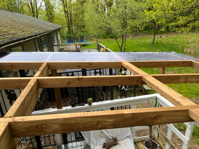The deck will be more usable now that it is covered, as we get a lot of rain here. Will it need some maintenance? Probably. I have fixed another similar roof where the northeast wind blew some sheets loose. Will it hold snow? I think so! It will block UV rays, not heat; shades can be installed below the joists/blocking.