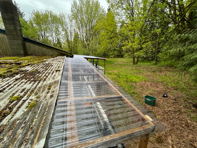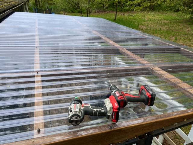 We chose clear PVC Palruf roofing as it was the most cost effective. It is installed using screws with rubber washers. Holes must be pre-drilled and larger than the screw to prevent cracking.