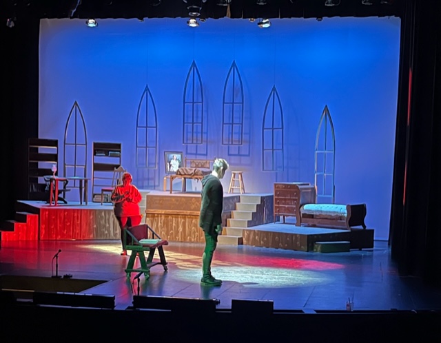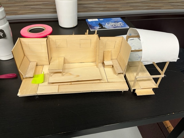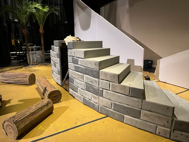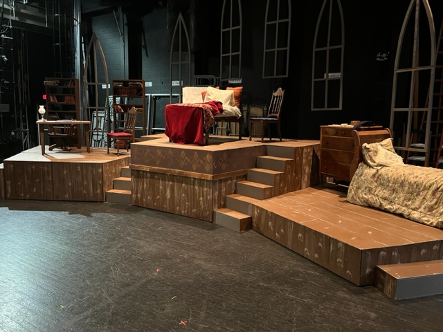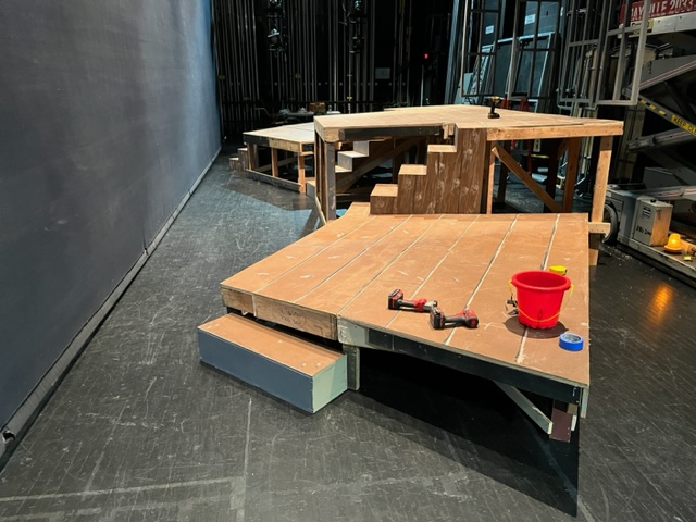 The main plan was a set of moveable stairs that stayed on the stage throughout the show (partly due to space constraints). Scenes were built around these, using their versatility. Following are some set build pictures and a few from the stage as well.