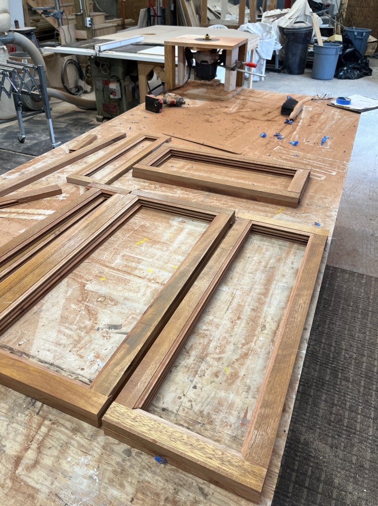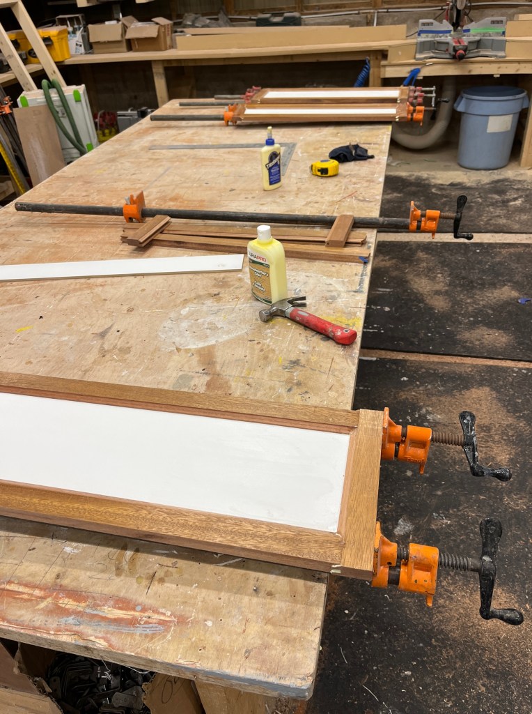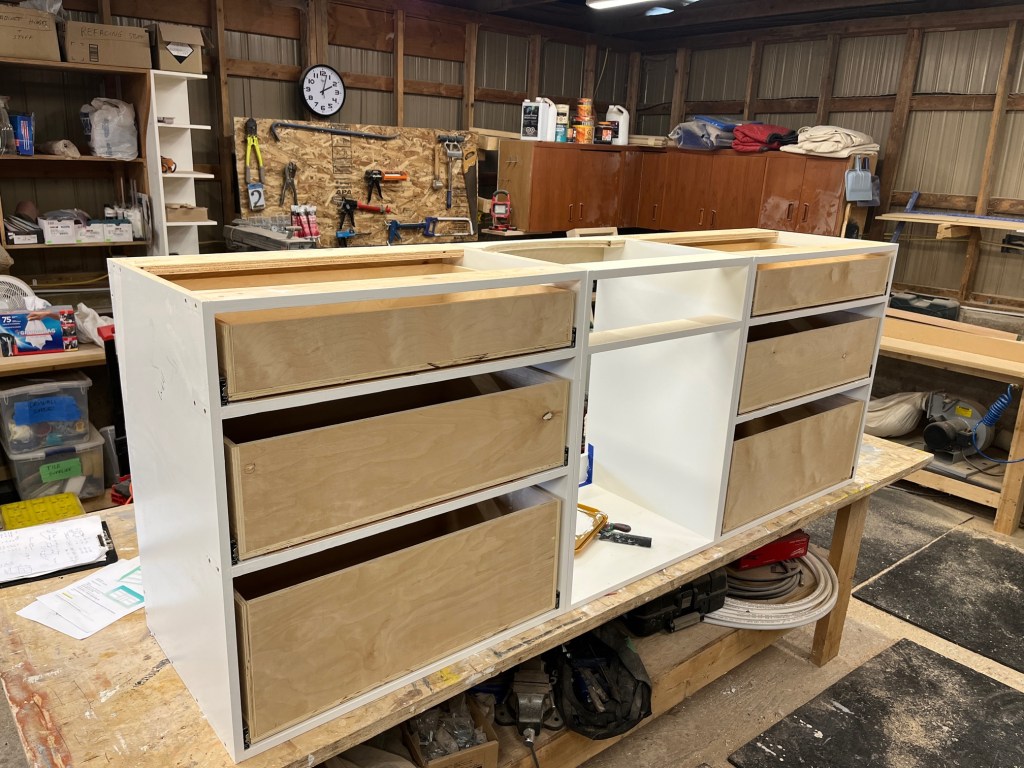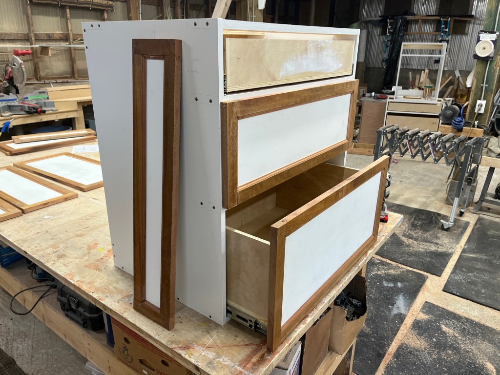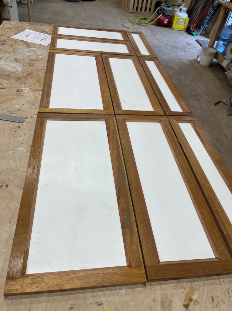 The drawer faces and doors were custom made stile-and-rail, ogee panel. I used 1/4″ white melamine for the panels and mahogany (I think) for the frames. It was time-consuming to get everything square and exact as possible. But also quite satisfying to do some “real” carpentry for a change!