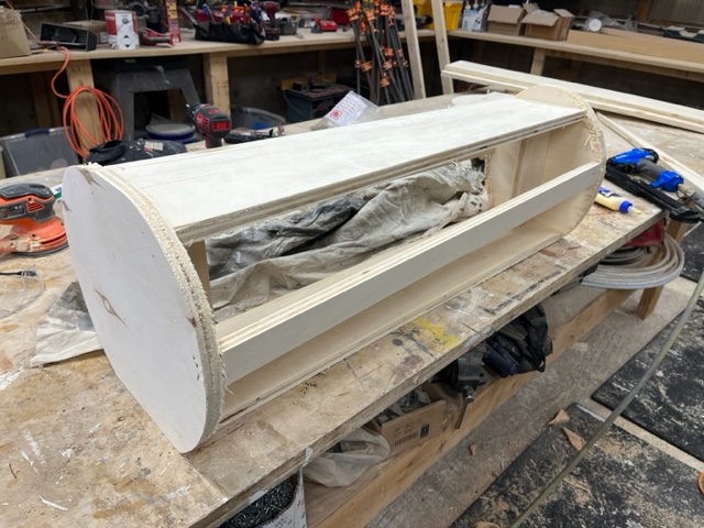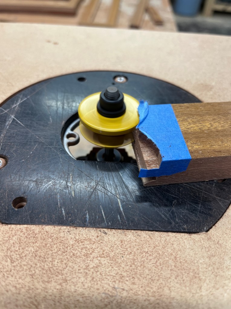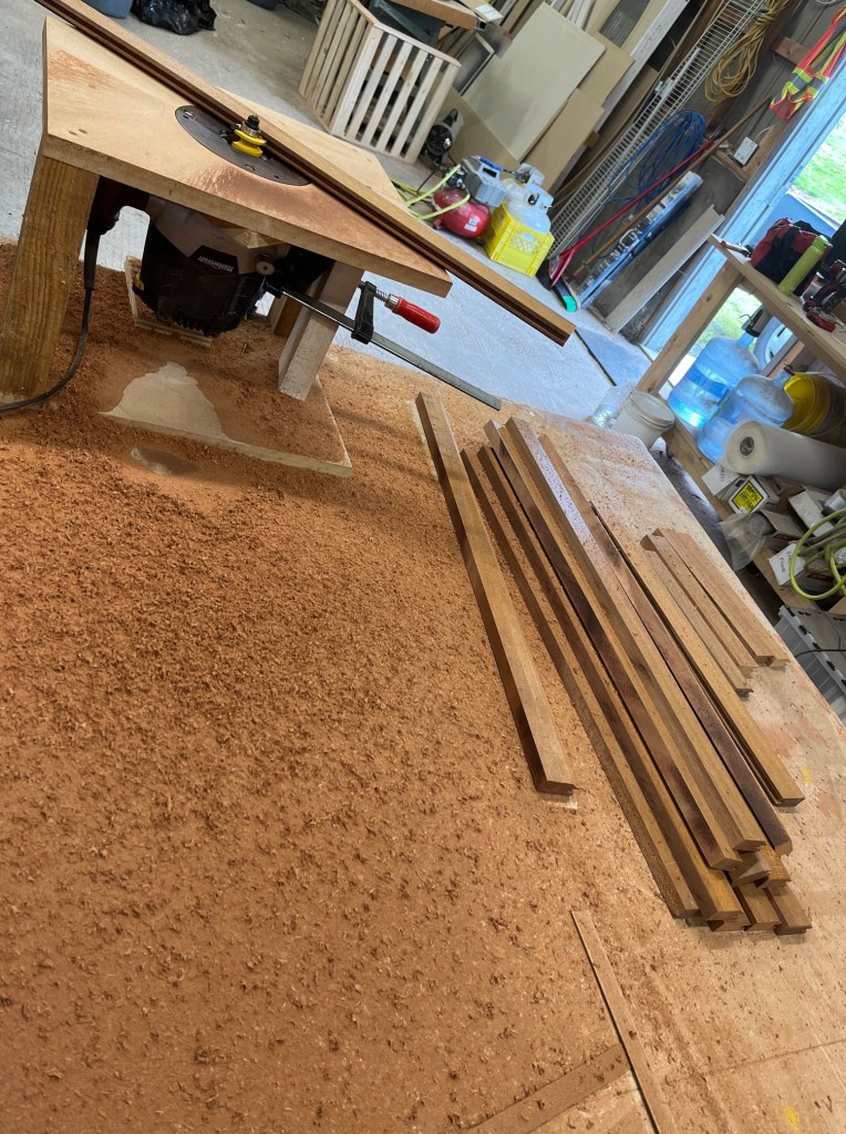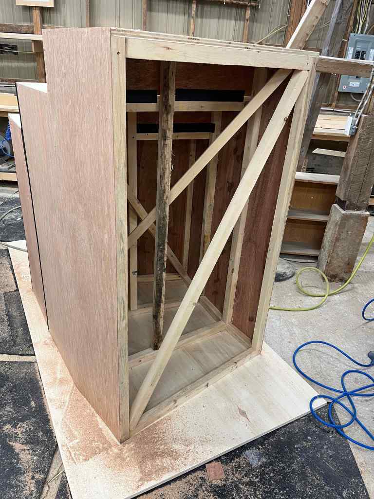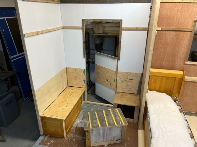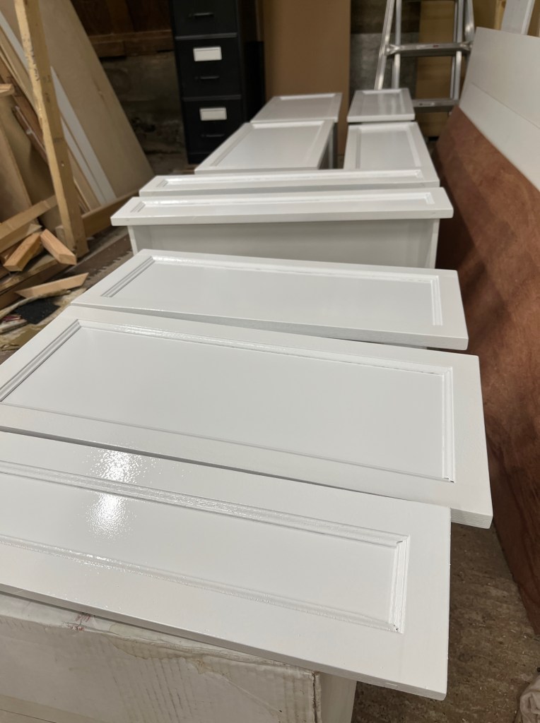 The drawer faces and doors were custom made stile-and-rail, ogee panel. I used 1/4″ white melamine for the panels and mahogany (I think) for the frames. It was time-consuming to get everything square and exact as possible. But also quite satisfying to do some “real” carpentry for a change!