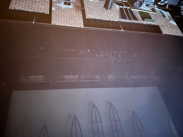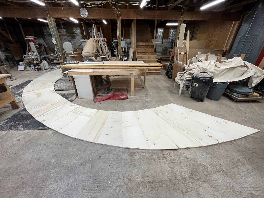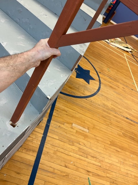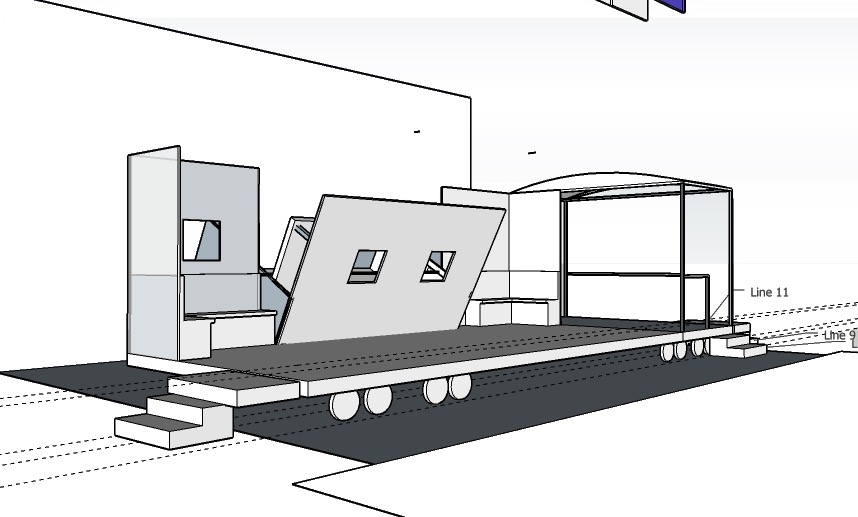 There is a wall that flips down to become a floor for scene changes. It is heavy as it is made of 3 sheets of 3/4″ plywood.