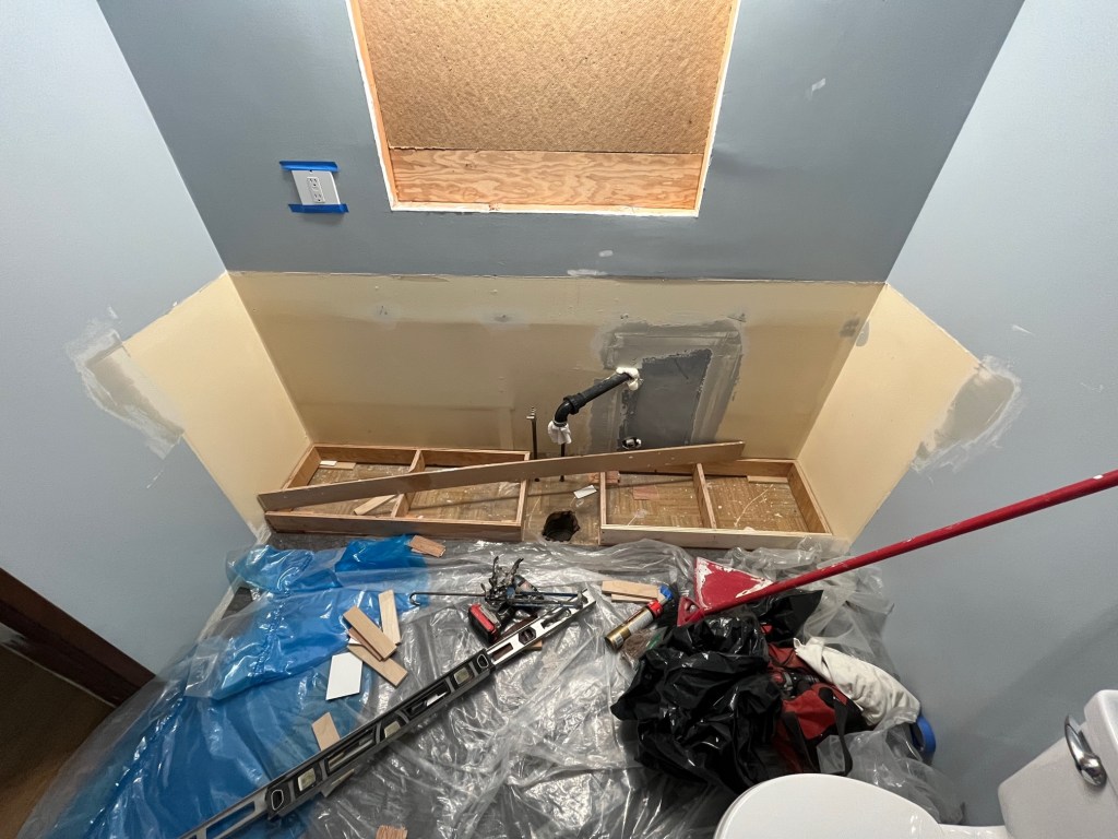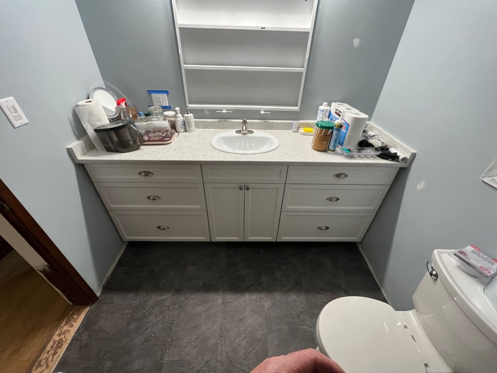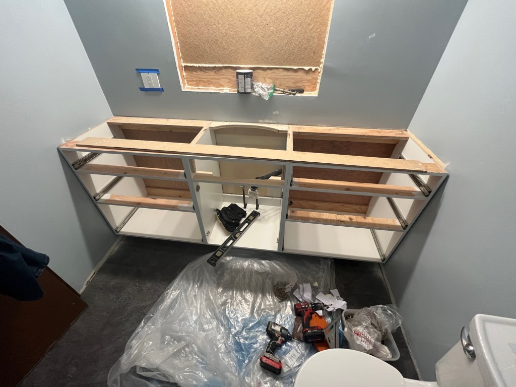 Colleen hired me to replace a bathroom cabinet. I took out the old one, sealed the wall/floor a bit, and built a new one from scratch. The countertop was done by another company.