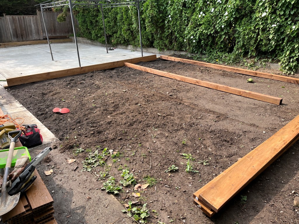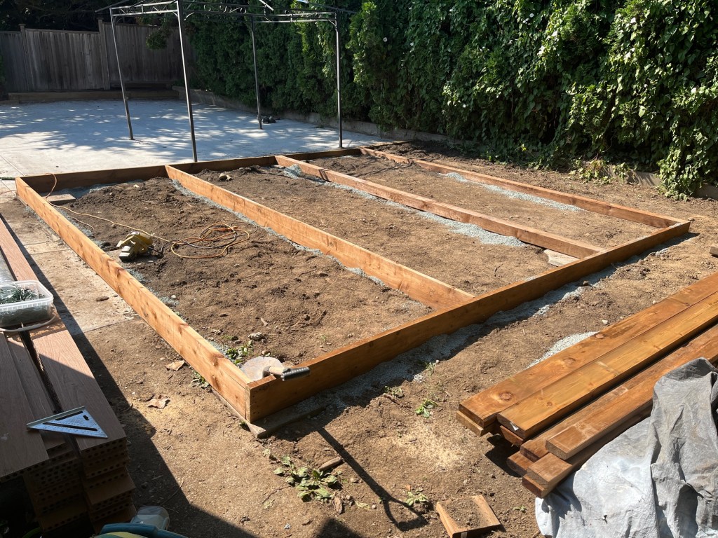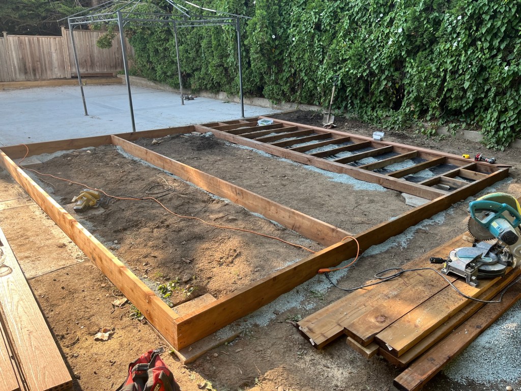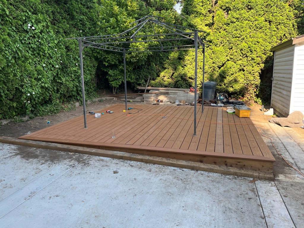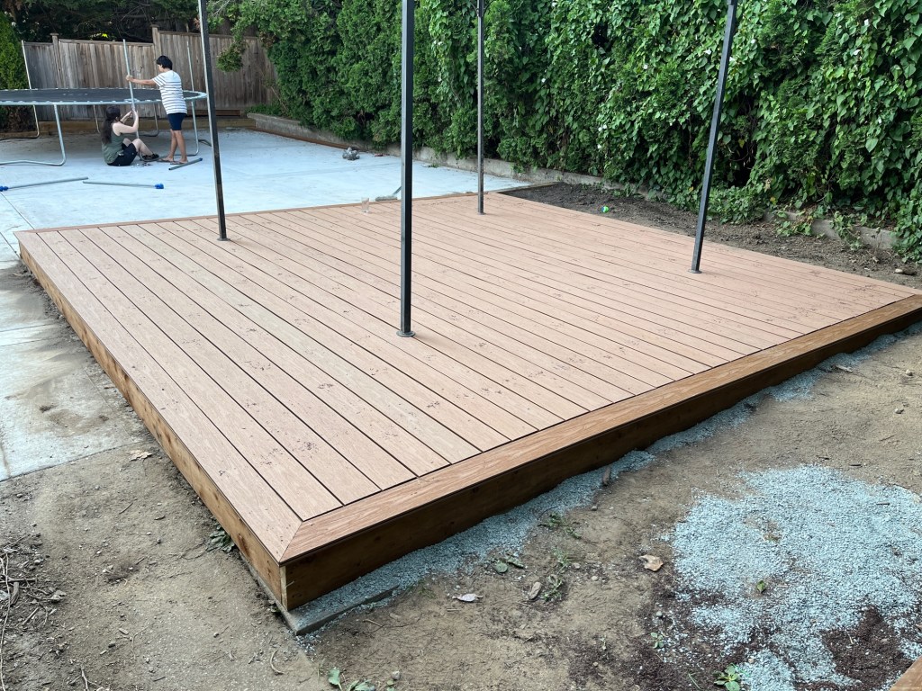 It took about 16 hours start to finish. Noel bought the decking on Marketplace at a good discount and I bought the pressure treated lumber for the base.