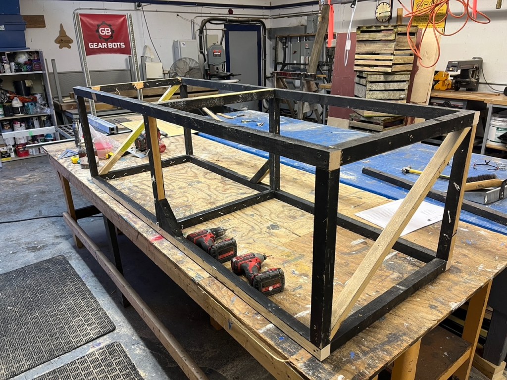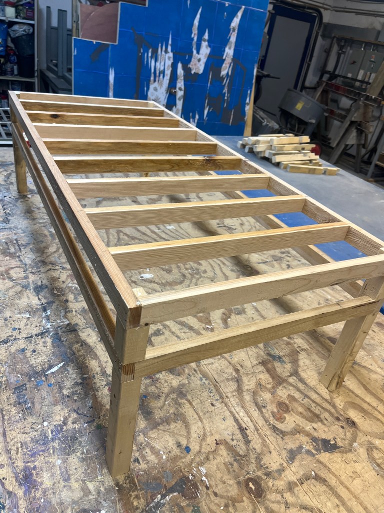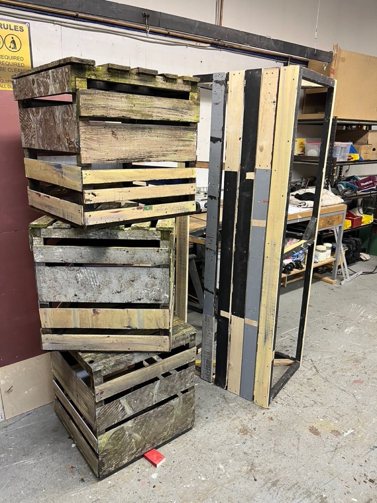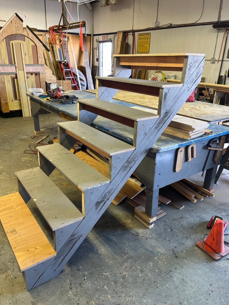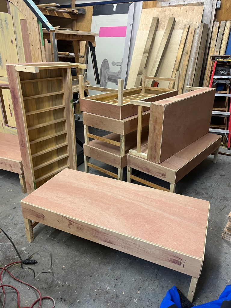 That was the basic set – arches, stairs, and walls. There were many other set pieces needed for the various scene changes: starting with the beds. I was quite proud of these – I made 8 – all very lightweight and stackable. The challenge was how to keep them from sliding around when the kids were jumping from one to another; some rubber furniture feet helped.