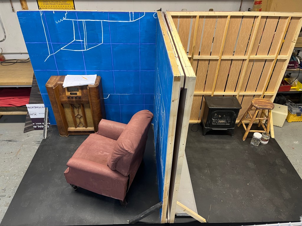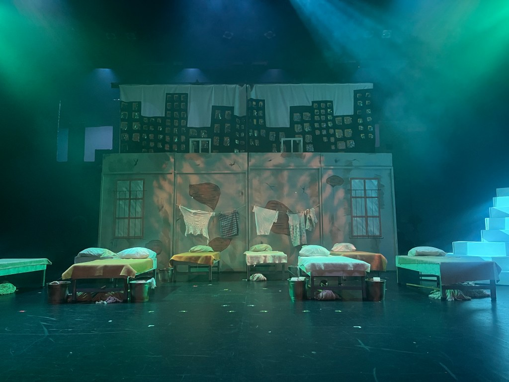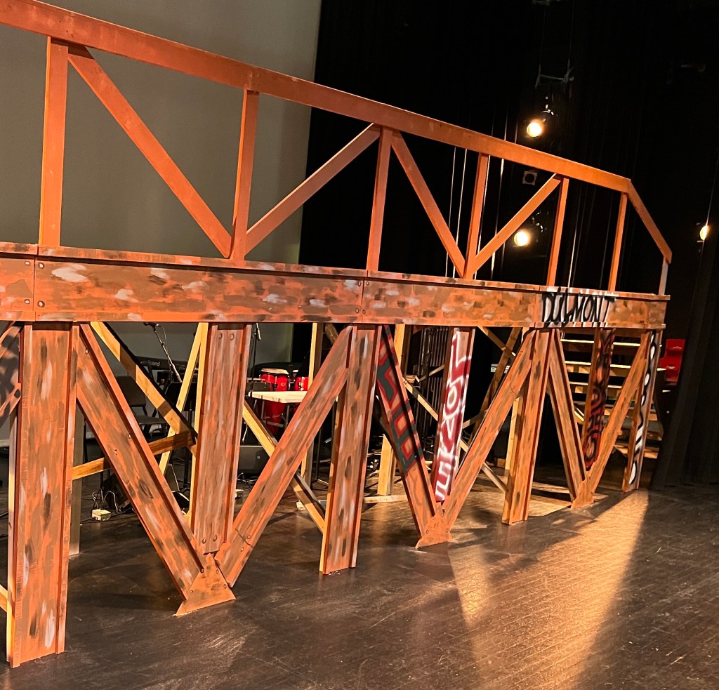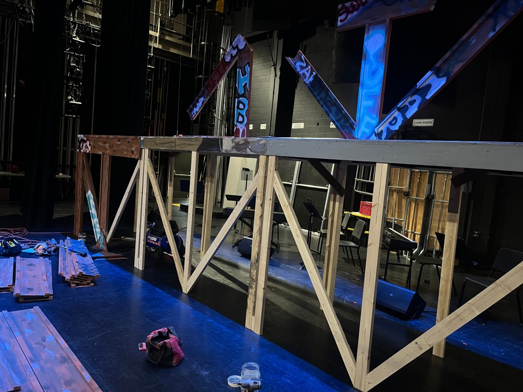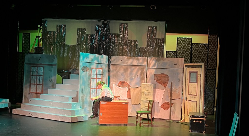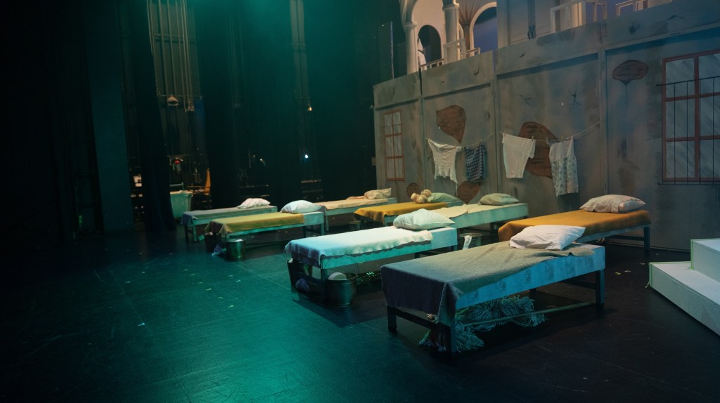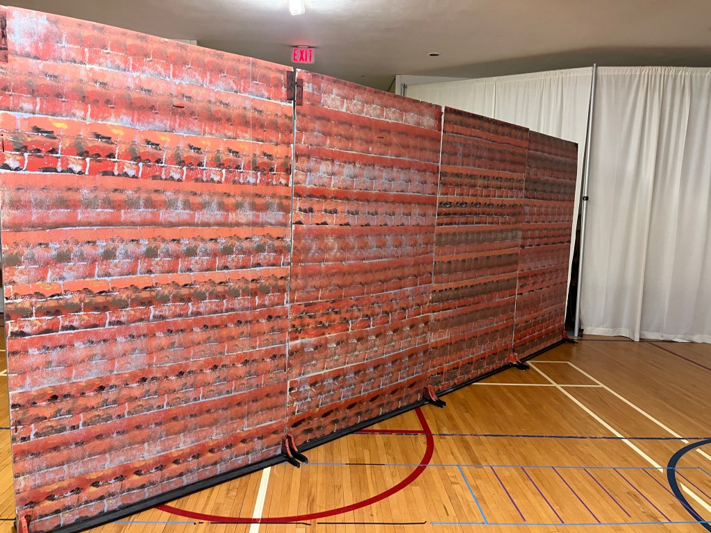 The NRT has limited wing space and no fly tower, so most things had to stay on the stage or be hidden just off-stage. I made 4 lightweight flats that were 5×8 feet to construct an orphanage and brick walls. They were made of foamcore, with wooden frames and legs.