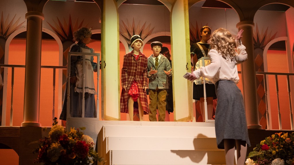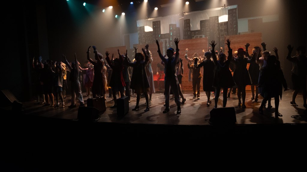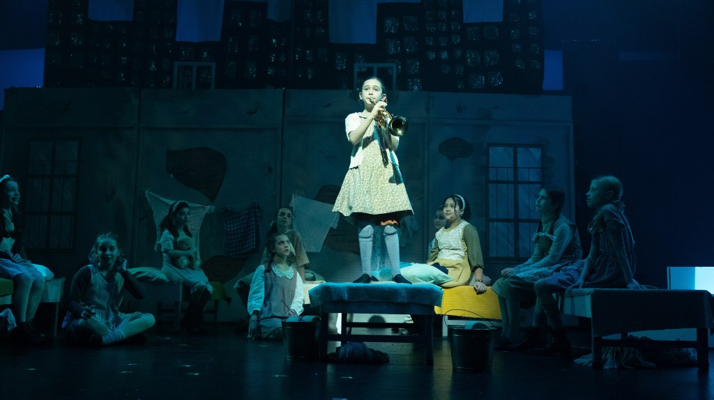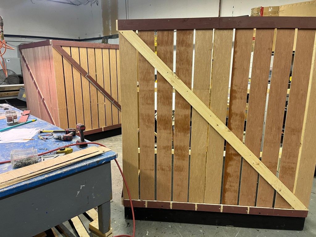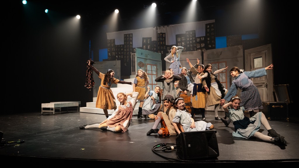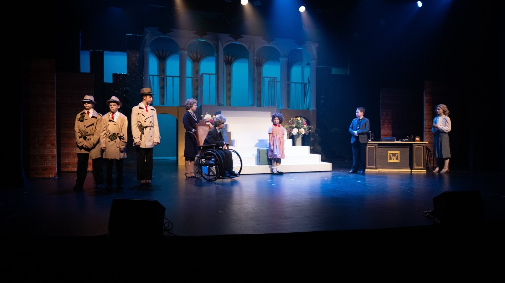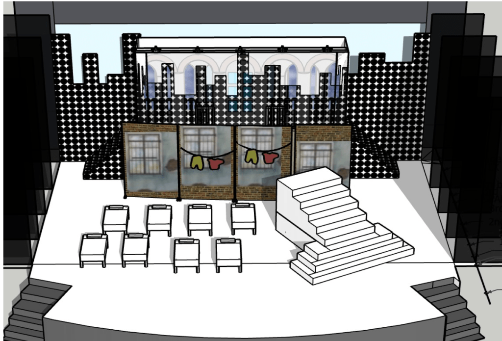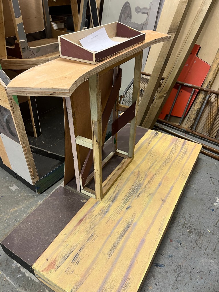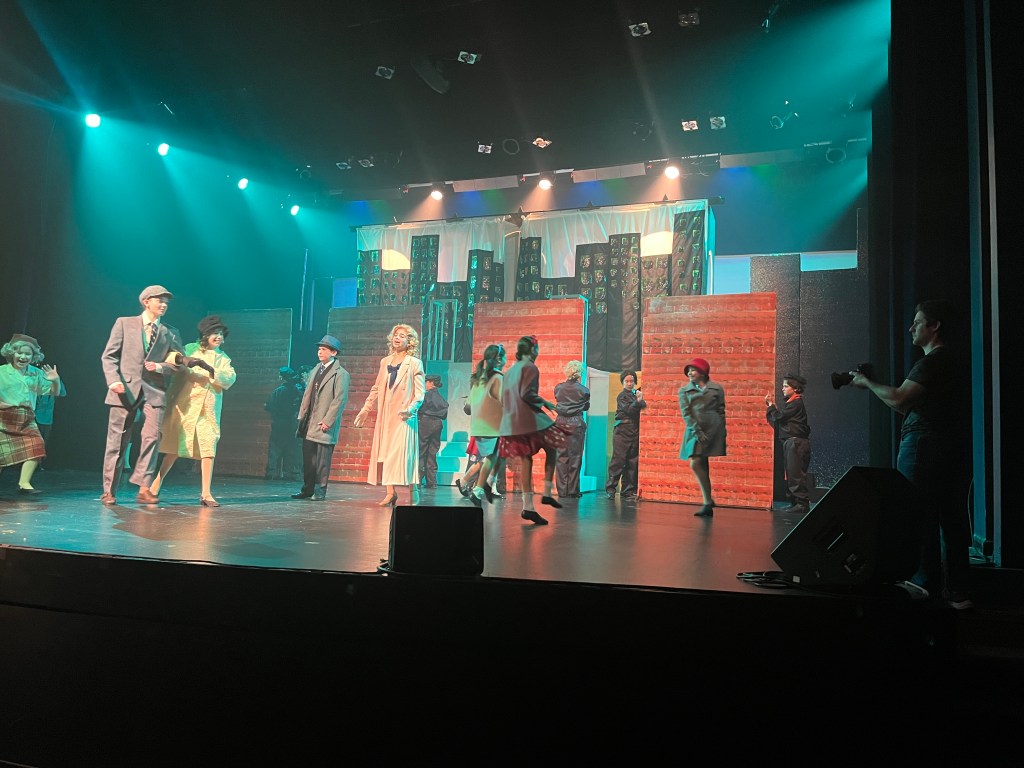 The NRT has limited wing space and no fly tower, so most things had to stay on the stage or be hidden just off-stage. I made 4 lightweight flats that were 5×8 feet to construct an orphanage and brick walls. They were made of foamcore, with wooden frames and legs.