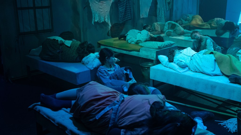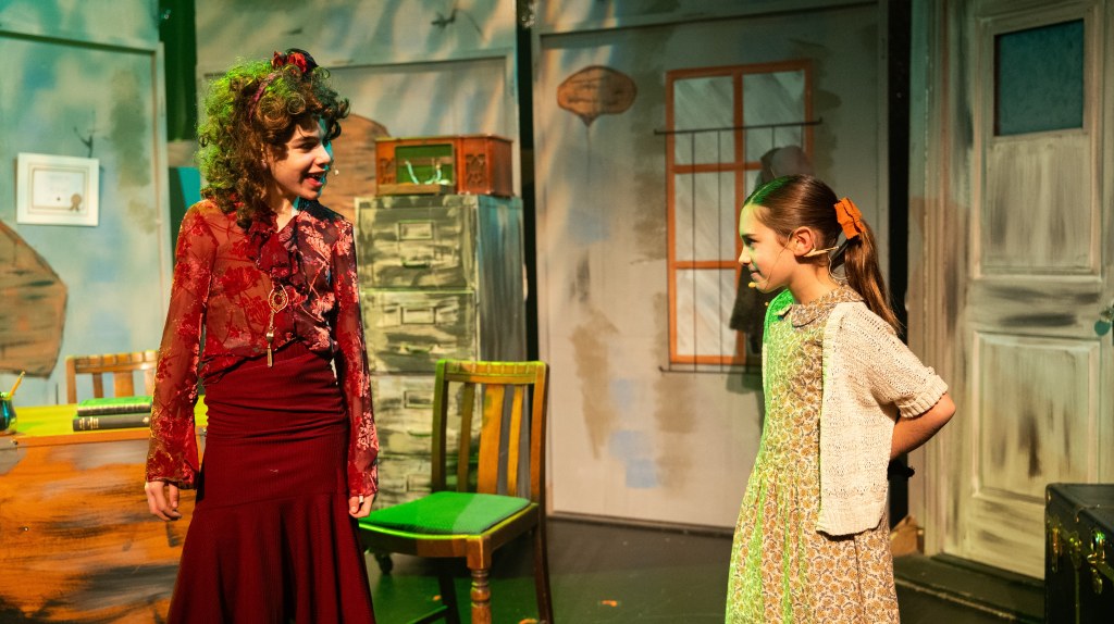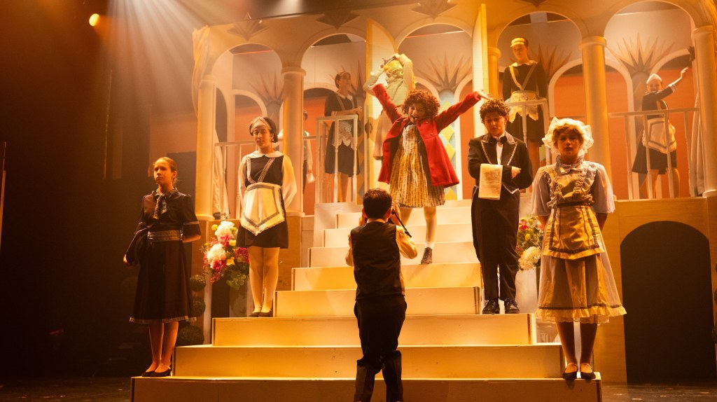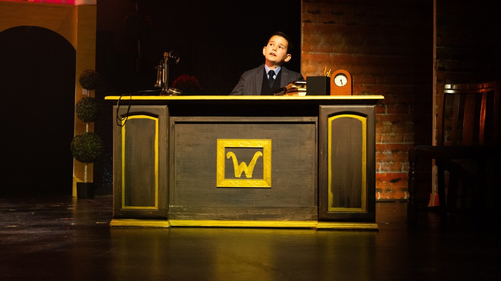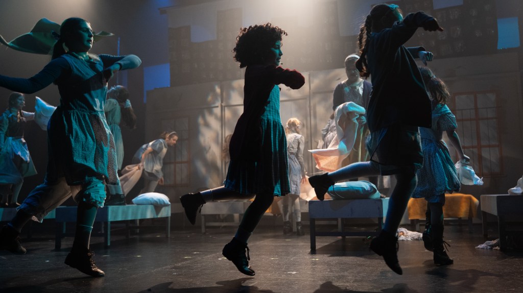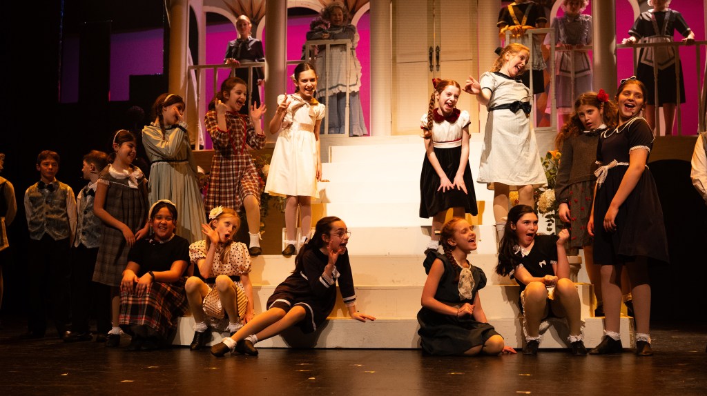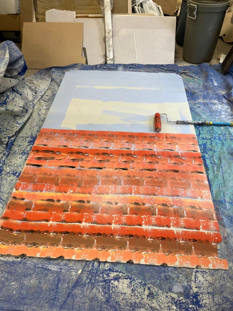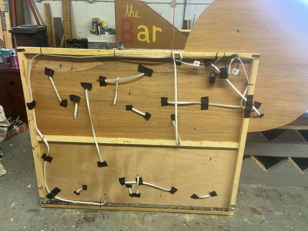 The NRT has limited wing space and no fly tower, so most things had to stay on the stage or be hidden just off-stage. I made 4 lightweight flats that were 5×8 feet to construct an orphanage and brick walls. They were made of foamcore, with wooden frames and legs.