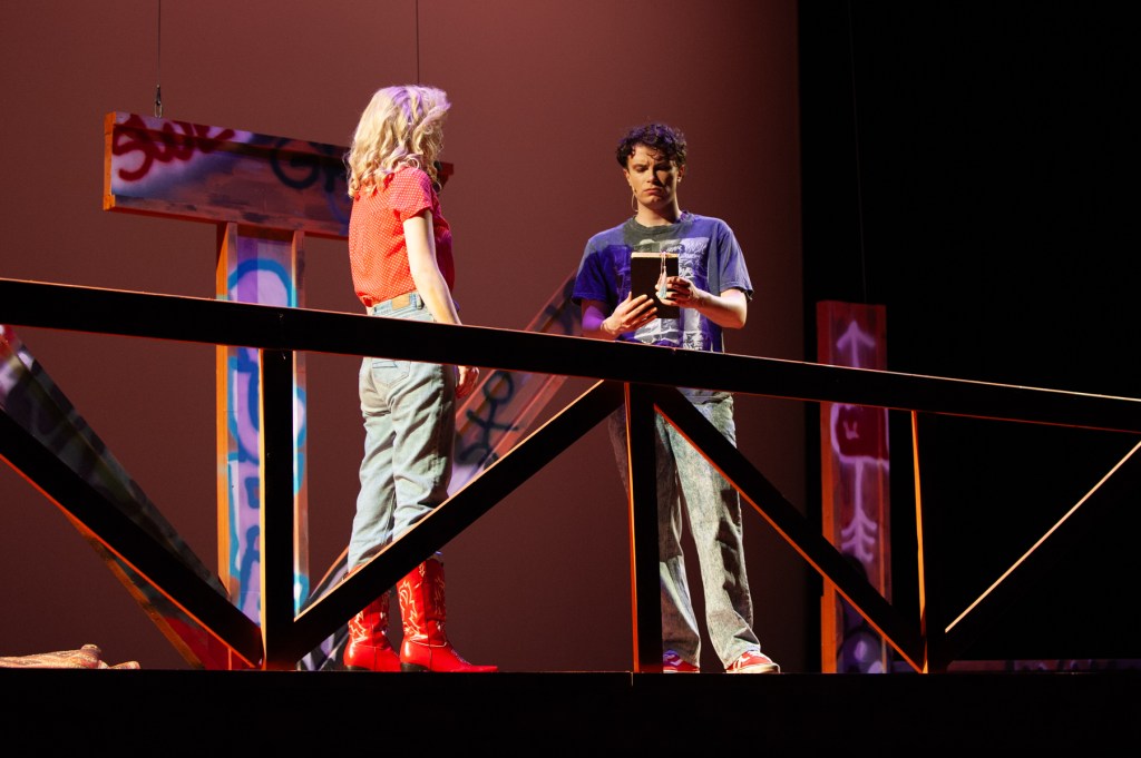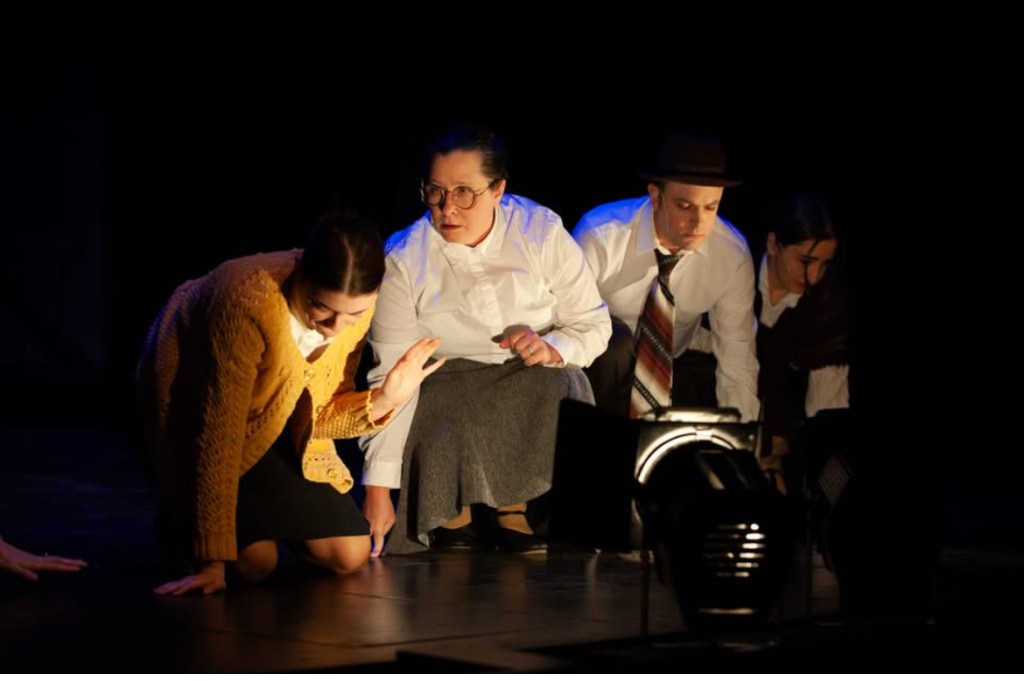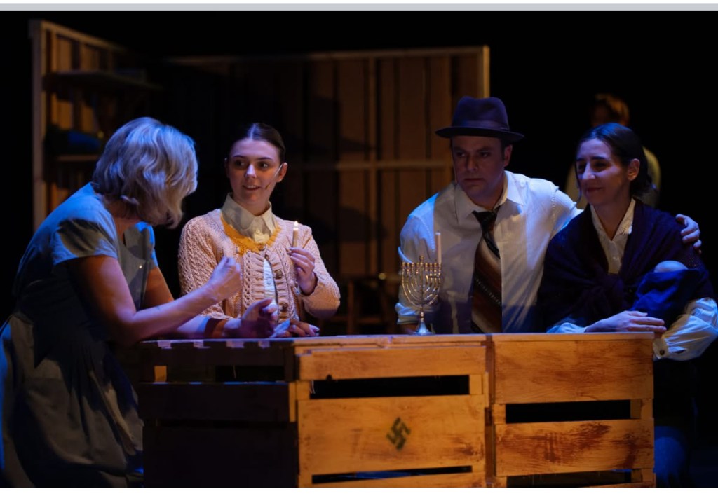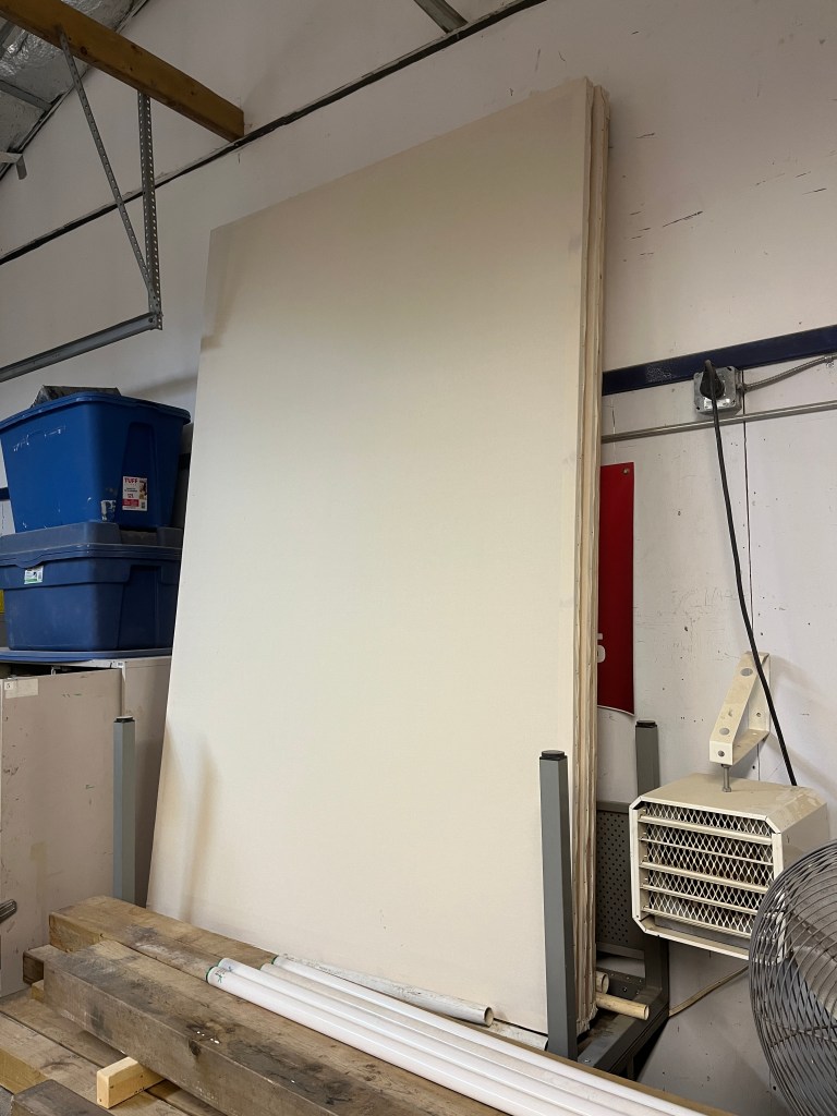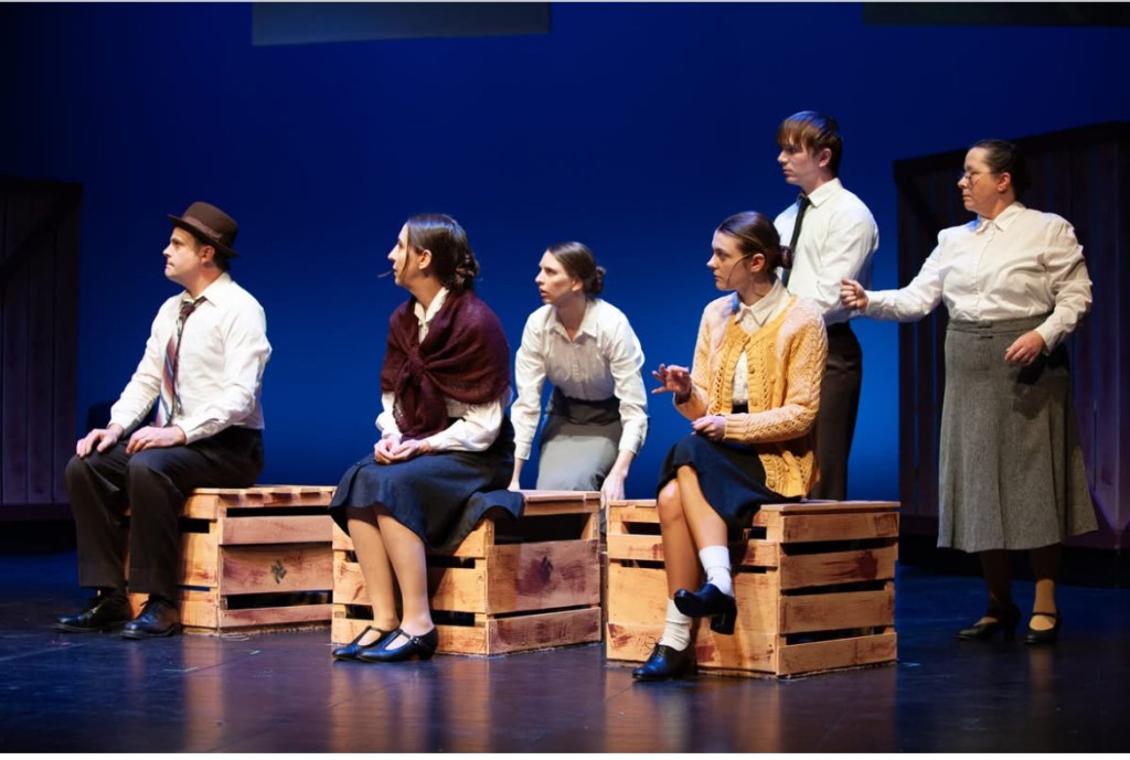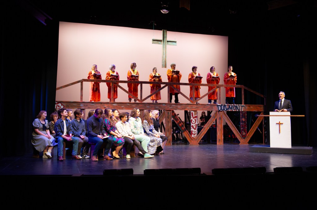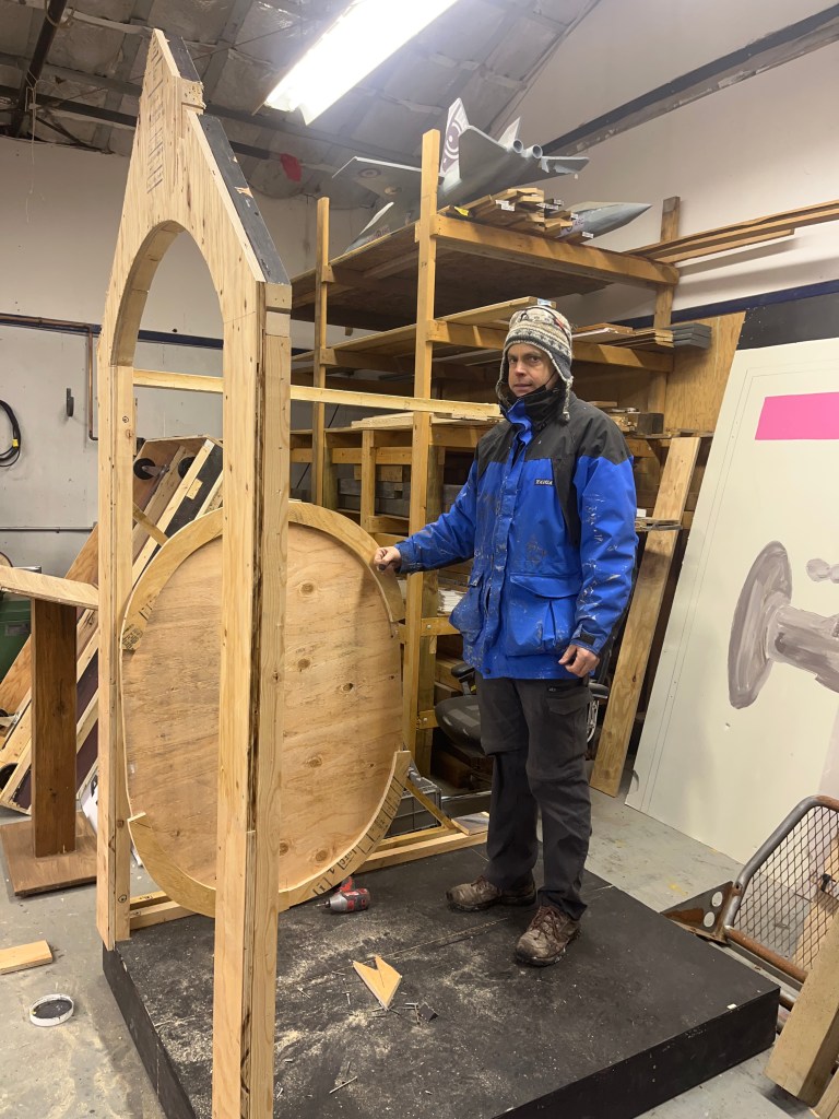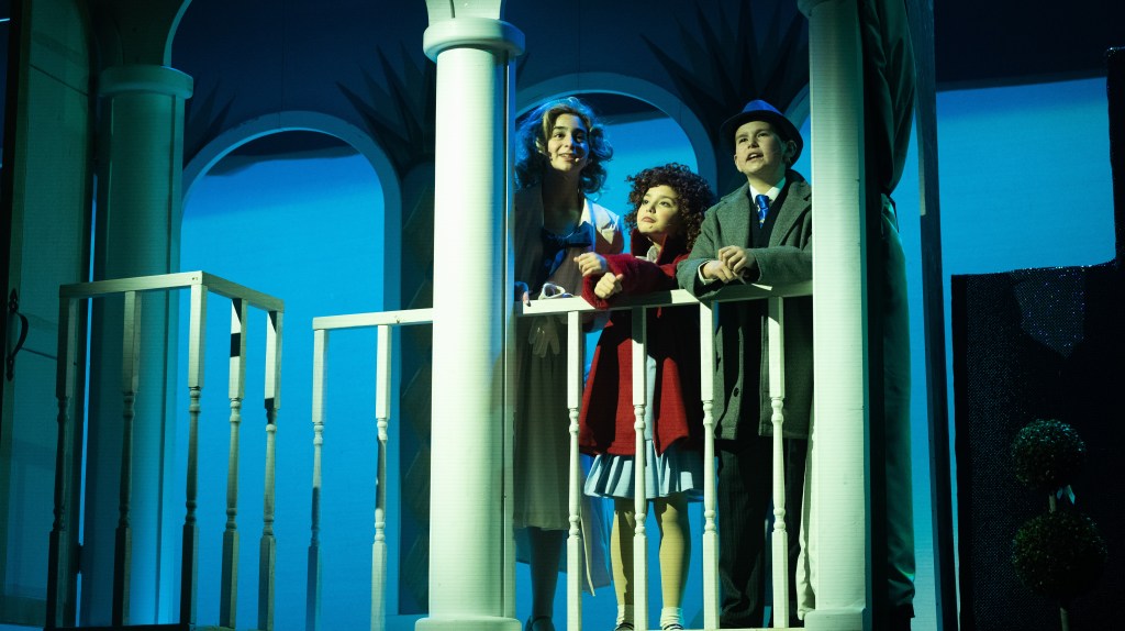 The NRT has limited wing space and no fly tower, so most things had to stay on the stage or be hidden just off-stage. I made 4 lightweight flats that were 5×8 feet to construct an orphanage and brick walls. They were made of foamcore, with wooden frames and legs.