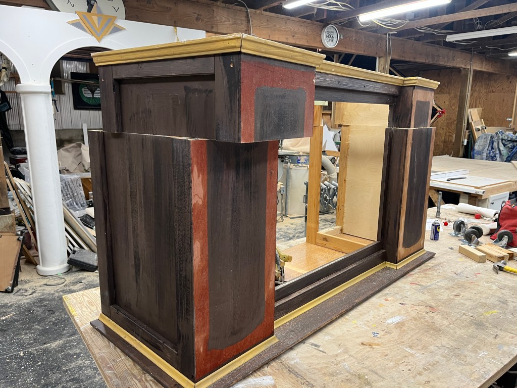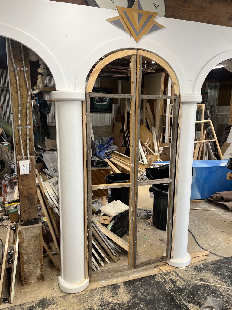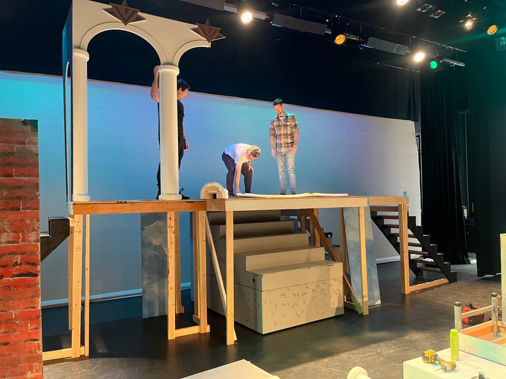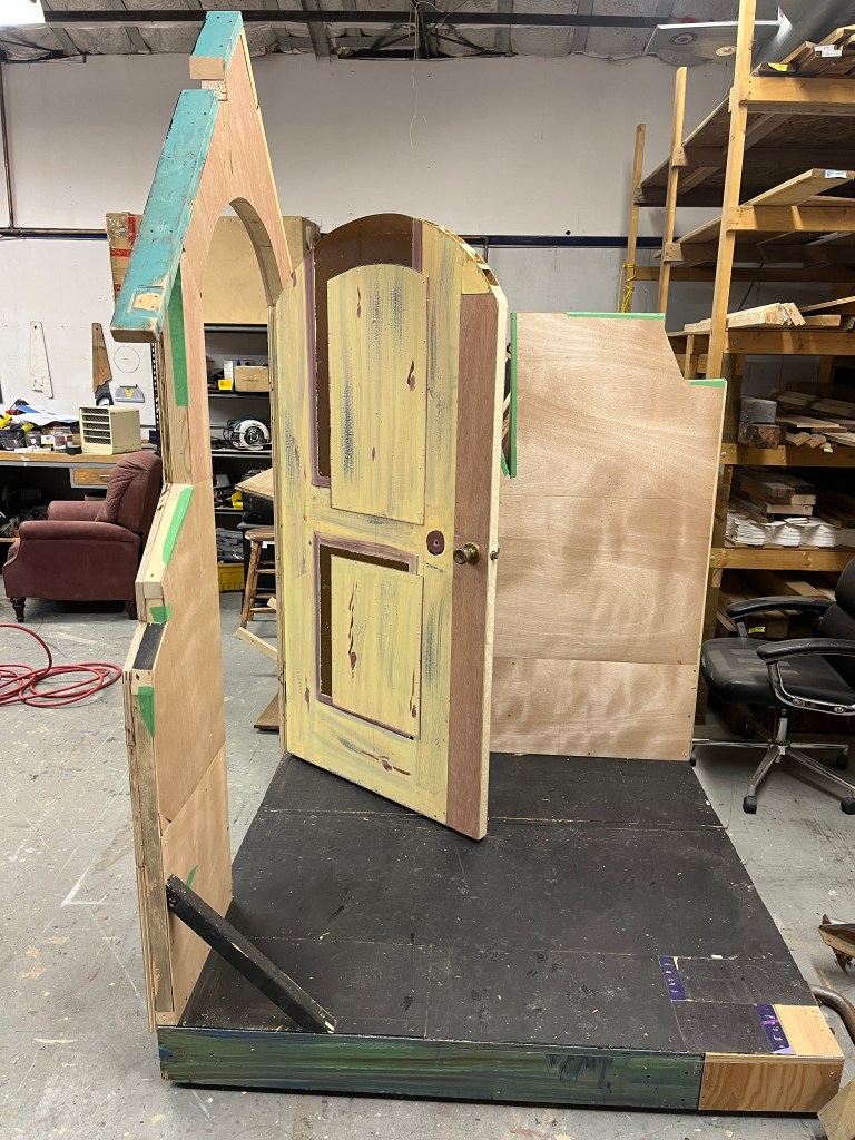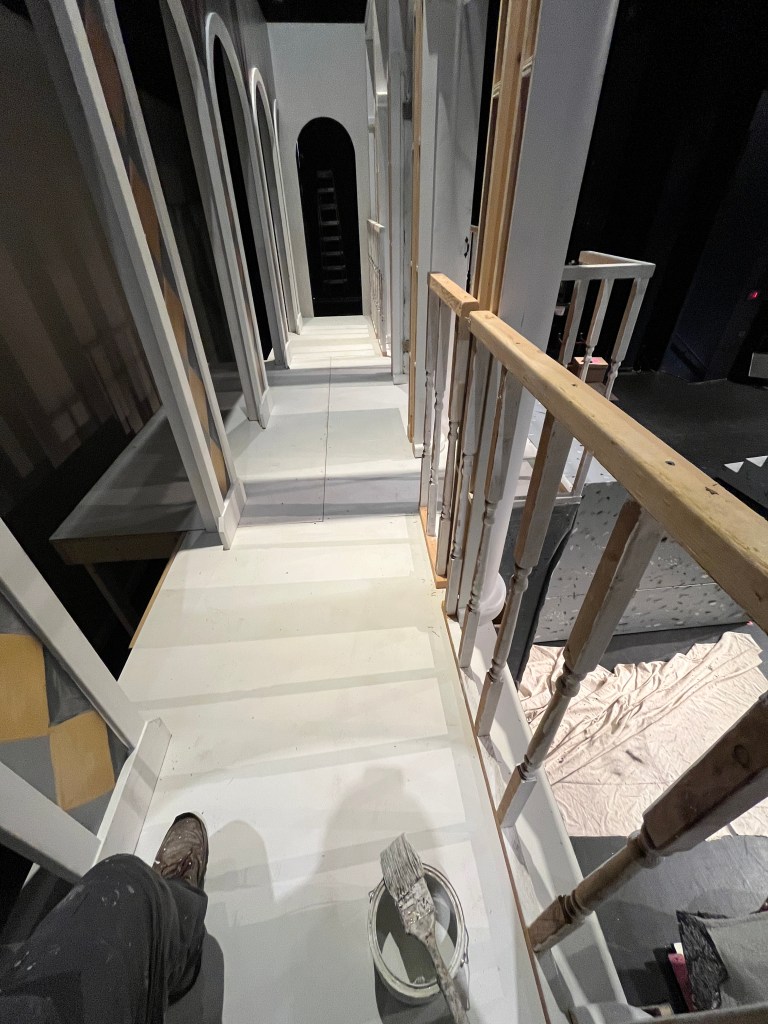 Our starting point was a 19-foot long set of arches that the director secured and stored at the school. This was to be the mansion and the only question was where would it go, and how would it look? I ended up making it a second level, intending to put the orchestra below, but eventually we just used the lower level for stair storage.