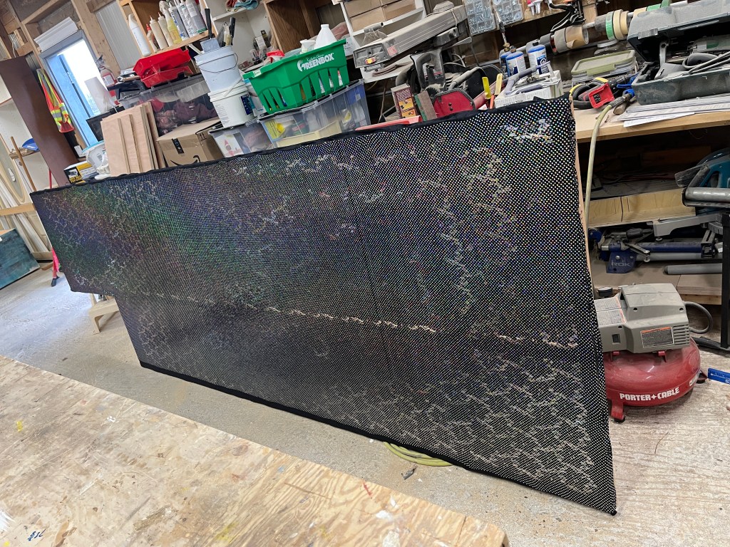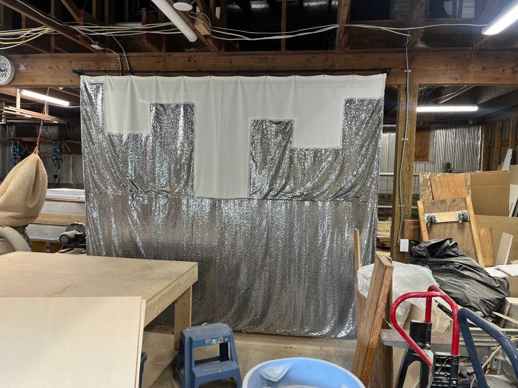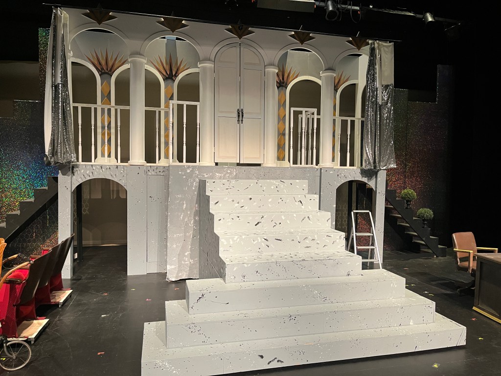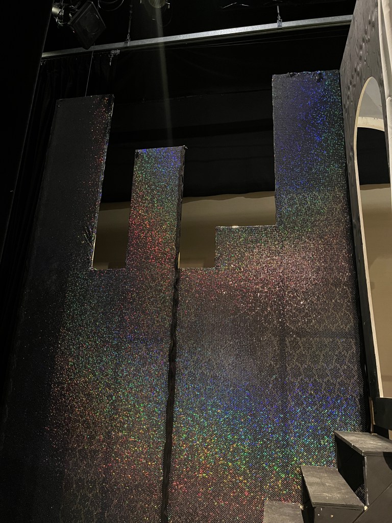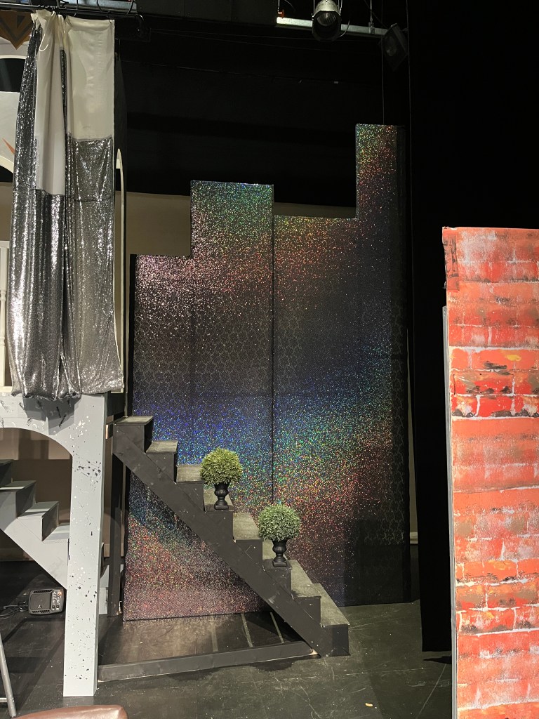 A big challenge for me was fabric – I wanted to hide the mansion at the beginning of the show, but since it was 14 feet high, the 8-foot flats wouldn’t quite do the trick. So I made a curtain rod at the top of the mansion and hung a curtain from that, with a cityscape sewn on. It didn’t quite work for the director, but they came up with a good solution thanks to our amazing costume designer’s help, and we were able to keep the curtain. I also made some large black city skyline frames on the sides, which looked fine, but were not as shiny and shimmery under stage lights as the expensive fabric I stretched on them promised. Live and learn!