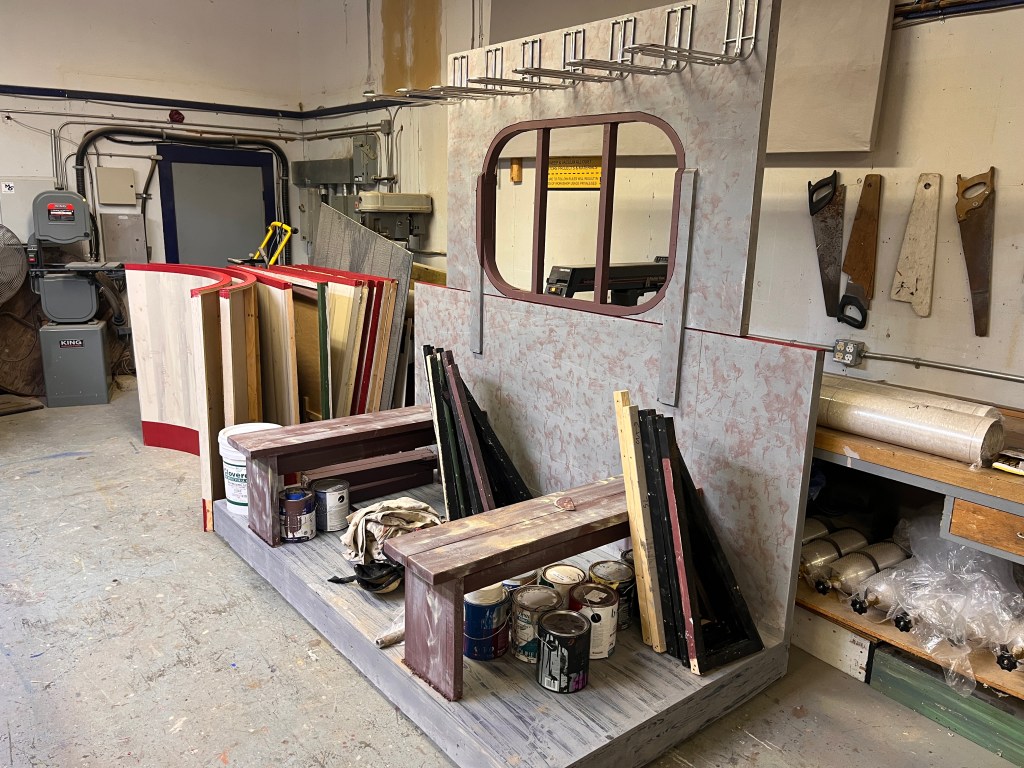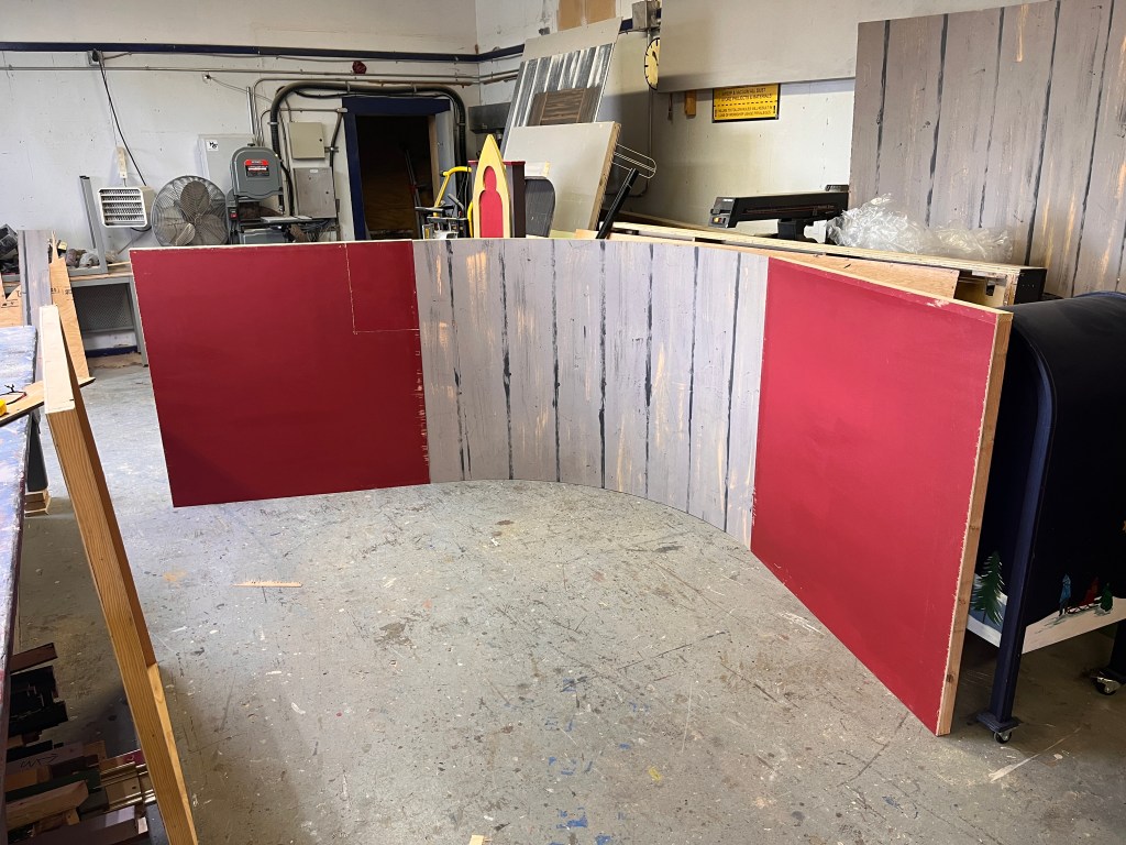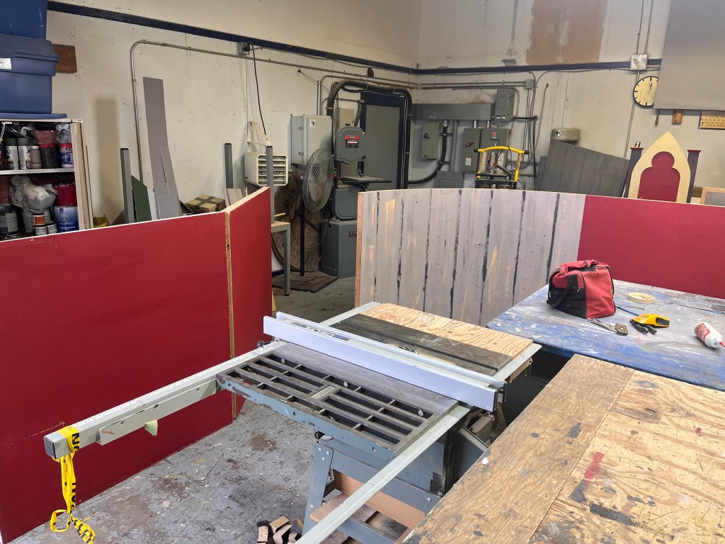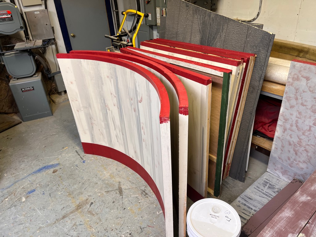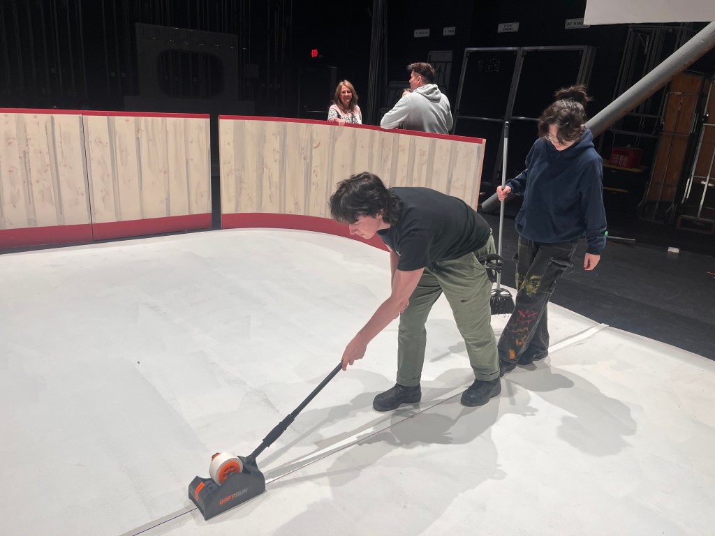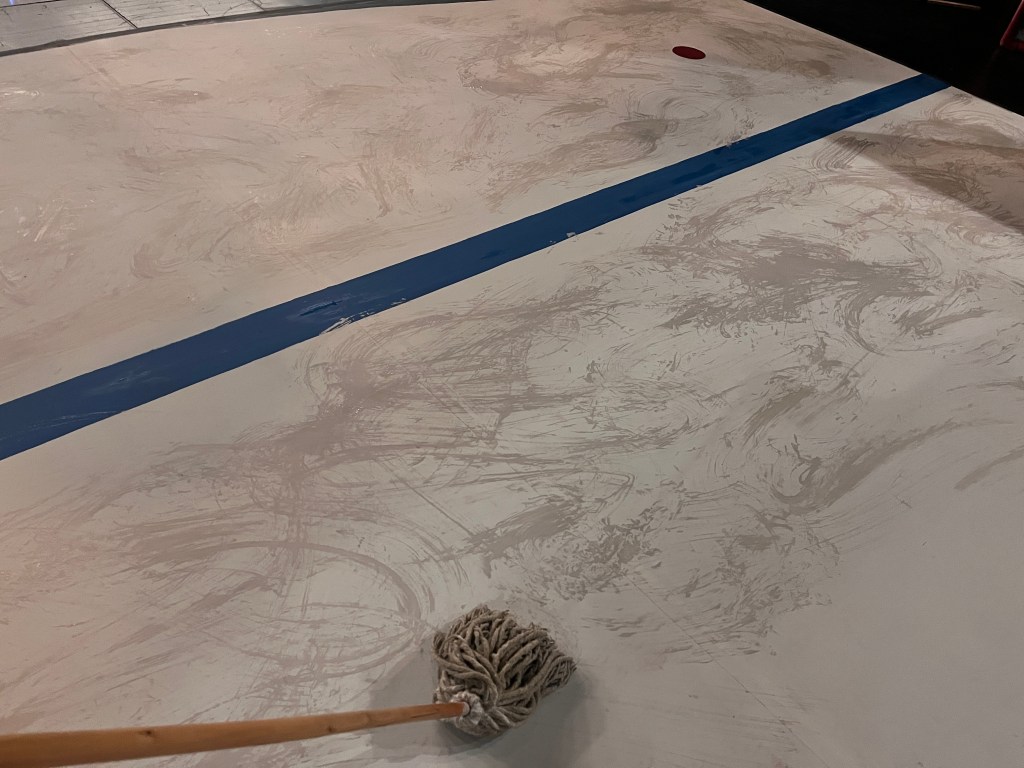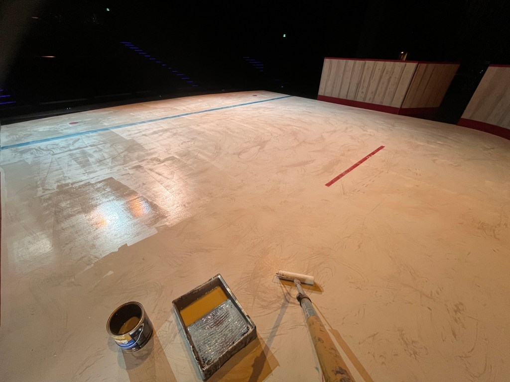 The “ice” turned out better than I expected. We used cheap sheet vinyl sourced from our local End of the Roll. I painted the bottom of it a light grey (it still looked bright white under lights). Then added some other colours to make it look dirtier, a couple coats of clear coat to protect it… it lasted the whole run but definitely got scuffed up by the hockey sticks and boots.