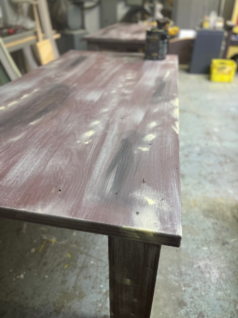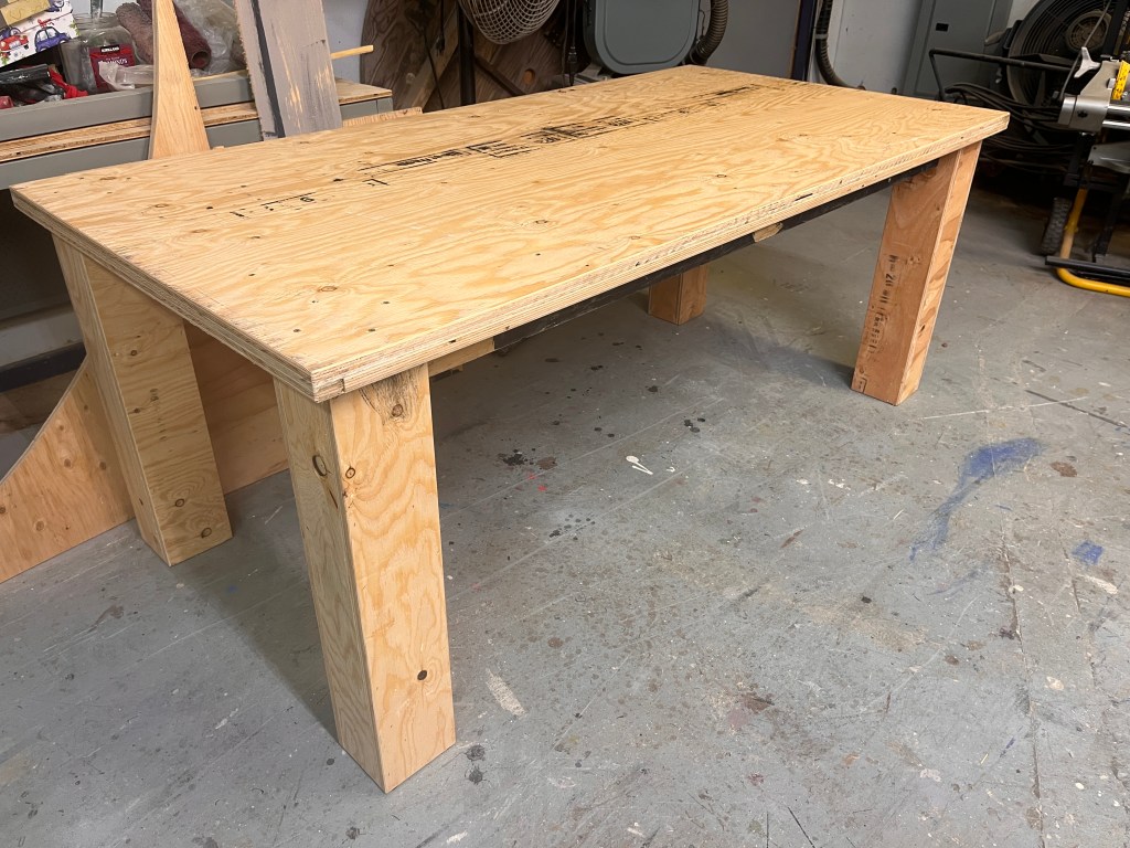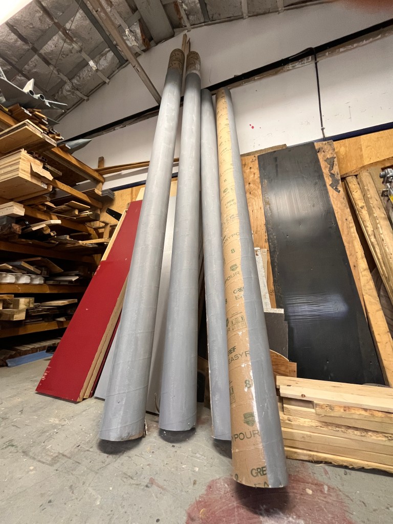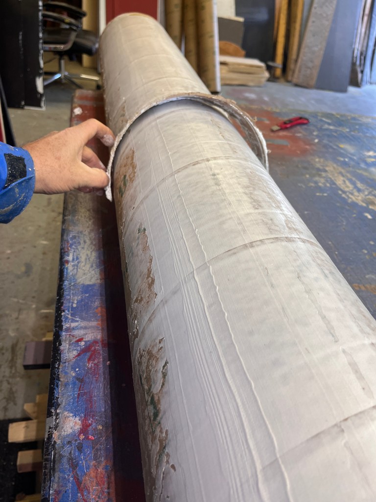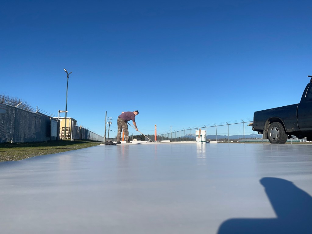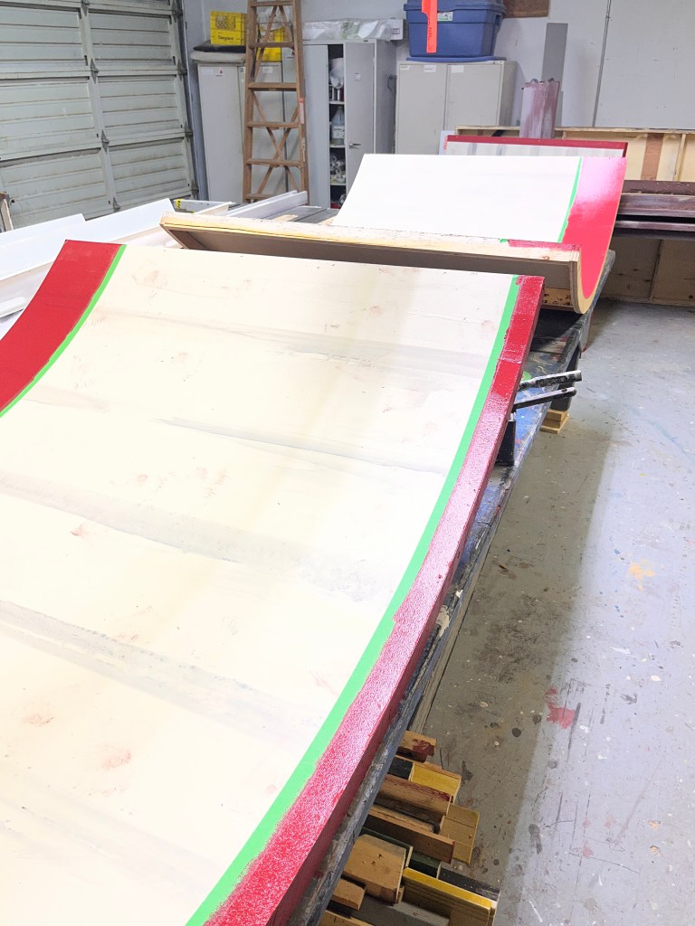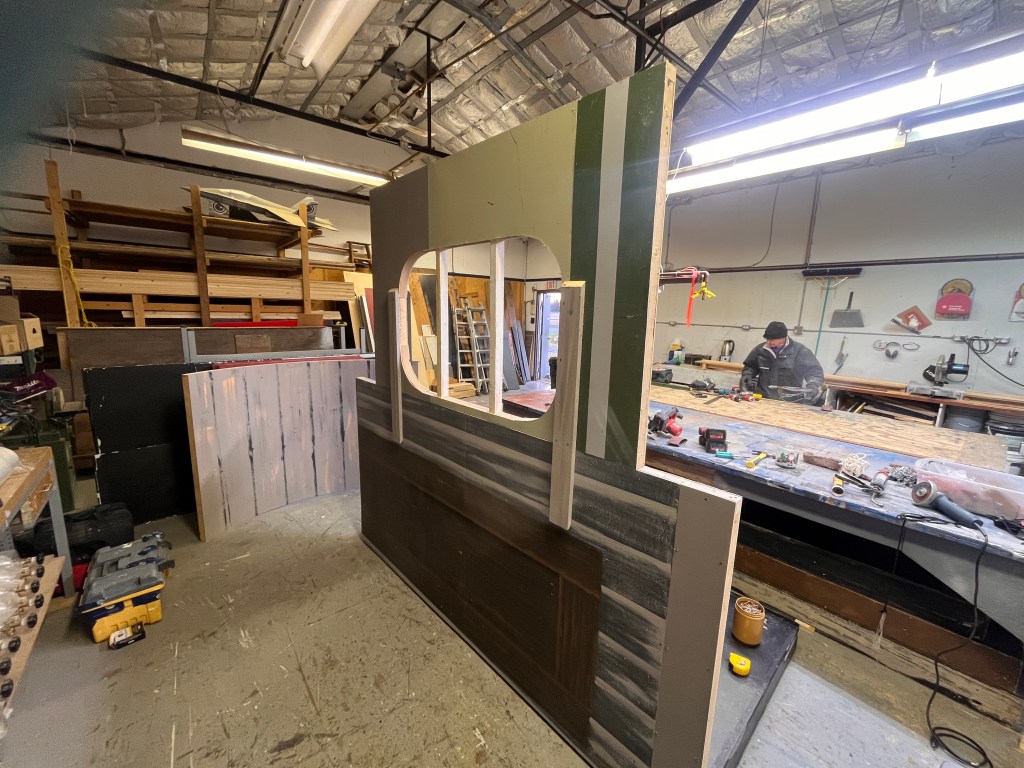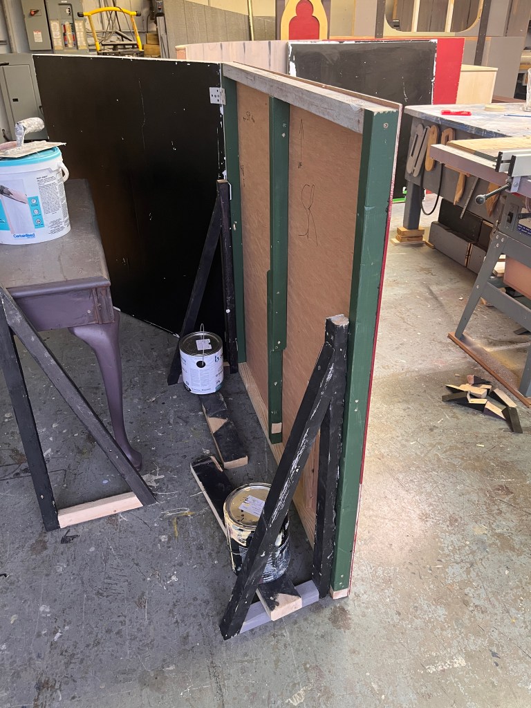 The “ice” turned out better than I expected. We used cheap sheet vinyl sourced from our local End of the Roll. I painted the bottom of it a light grey (it still looked bright white under lights). Then added some other colours to make it look dirtier, a couple coats of clear coat to protect it… it lasted the whole run but definitely got scuffed up by the hockey sticks and boots.