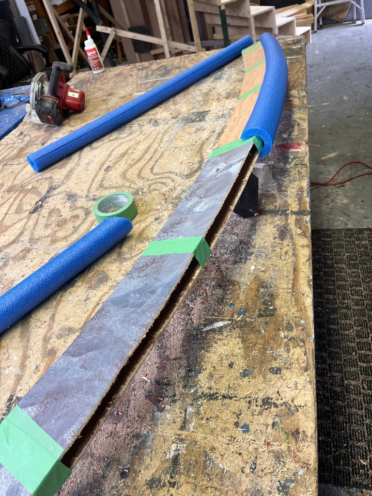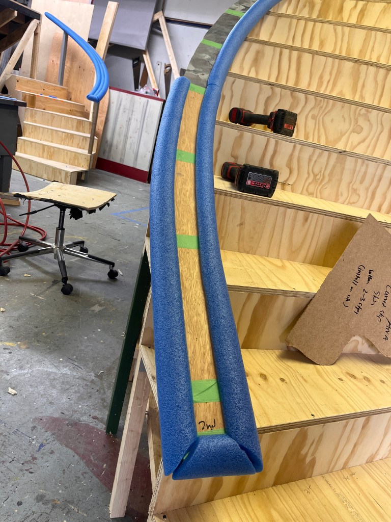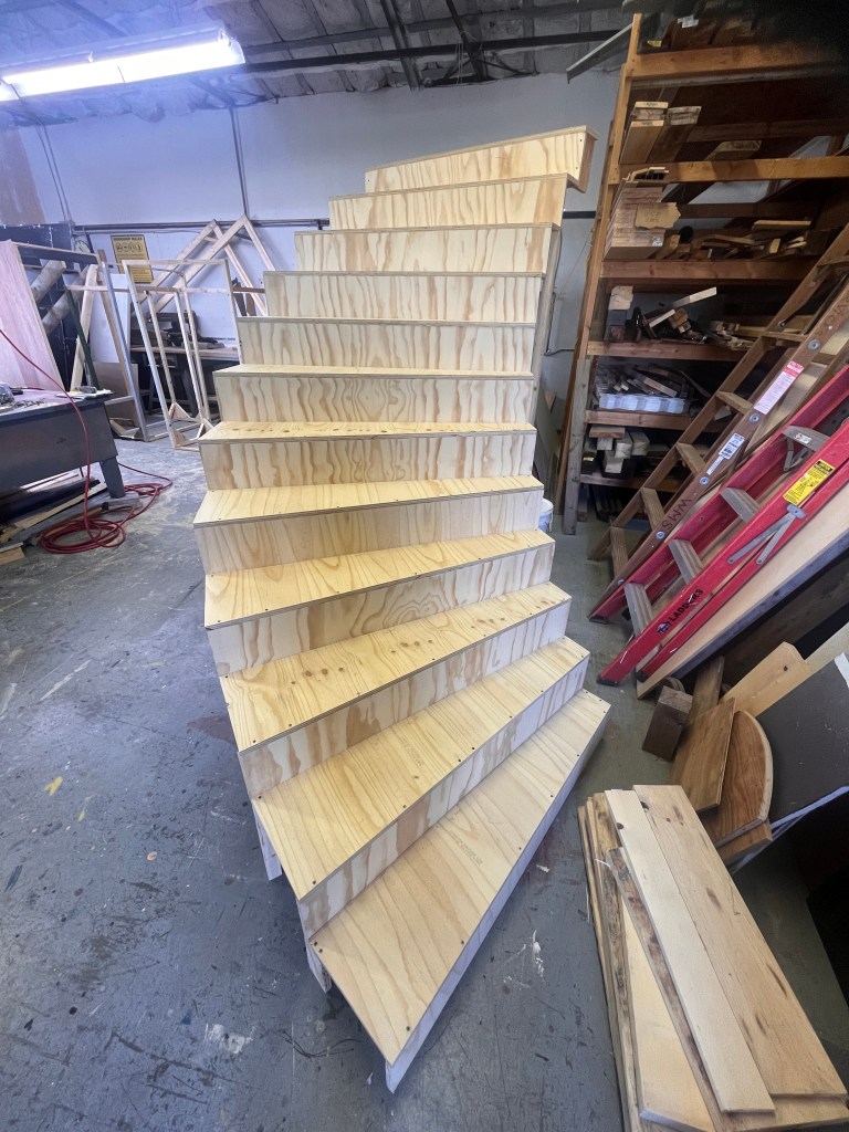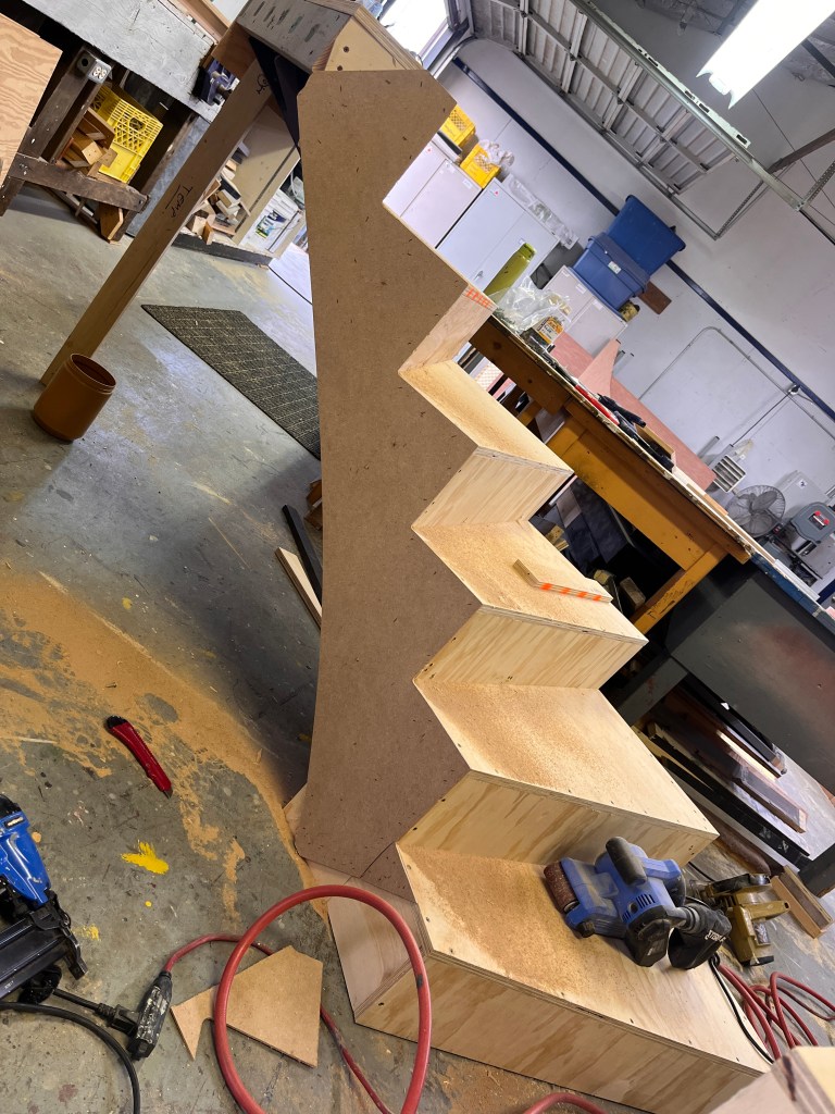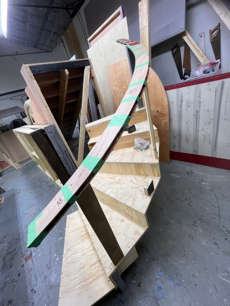 The curved stairs were designed well and fairly easy to build. The railings were a bigger challenge – curved with balusters. (There is another blog post about the balusters.)