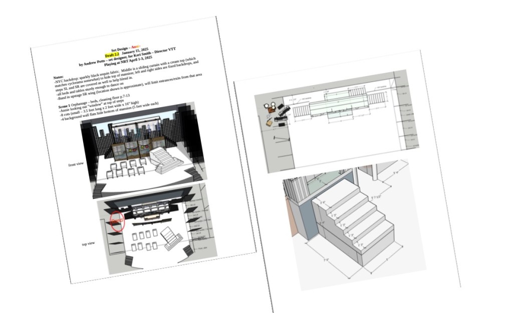 After agreeing on a basic design, I draw sets to scale with Sketchup Pro and consolidate the major scenes into a PDF draft document. I can then add dimensions and textures as required.
