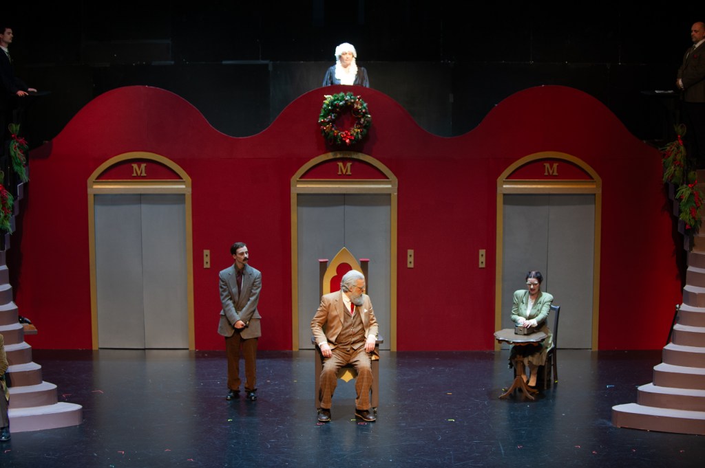 It was a cool, abstract set–great design work by Mr. Jeans! However with the curved stairs, the large platform, the 40 foot wide x 19 foot high city-scape and the six elevator doors…it was time consuming to put together. Plus…I will not mention the half-unexpected mid-run strike! =)