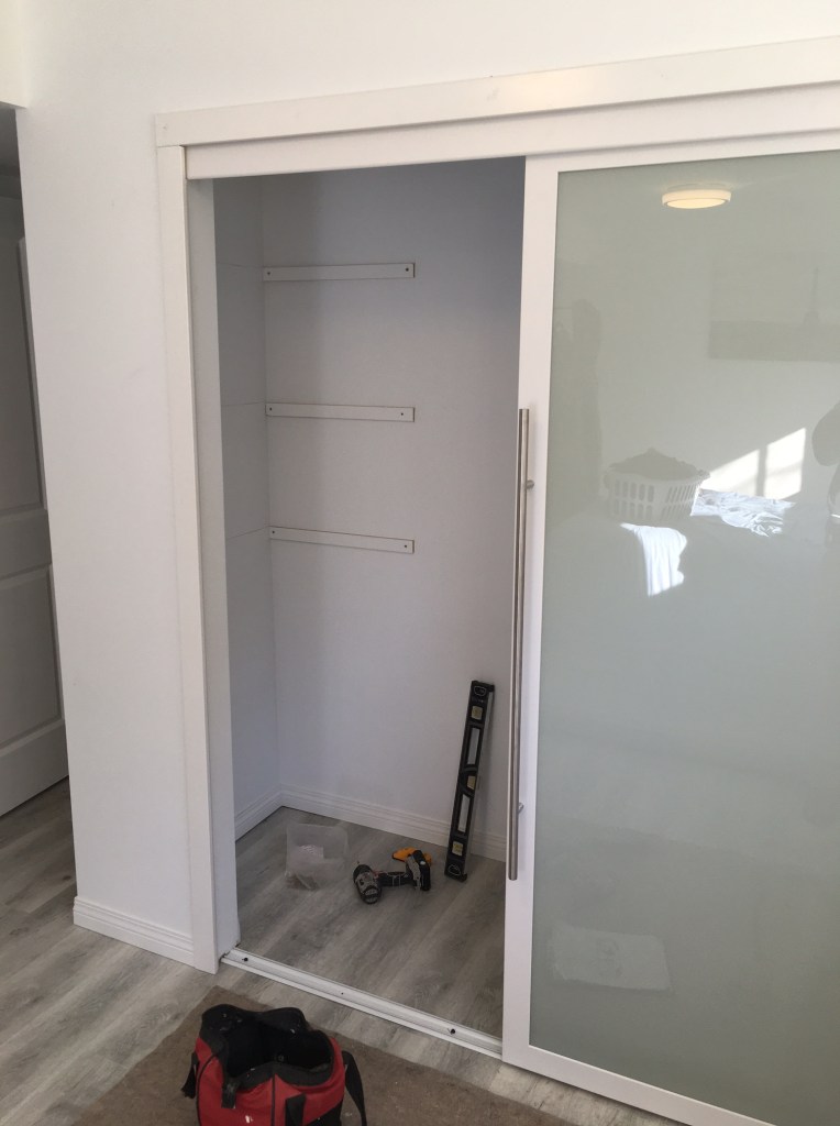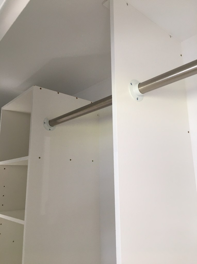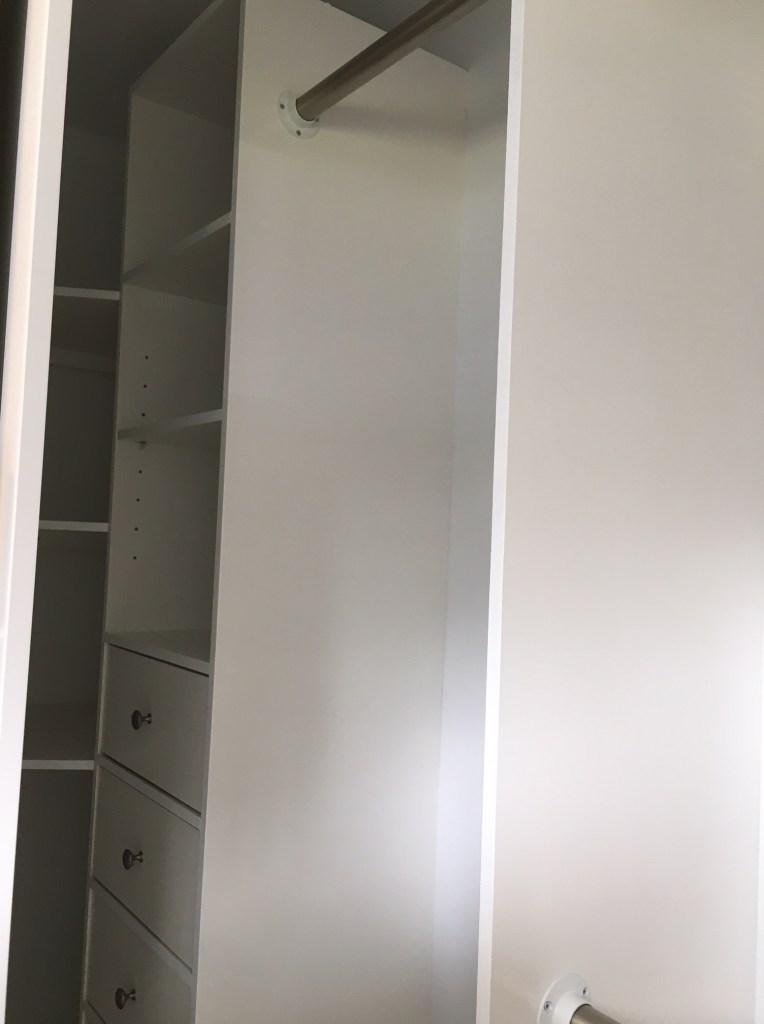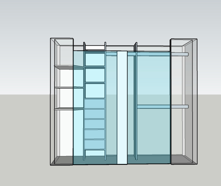 She wanted it centered so that a couple of barn doors can be added in the future. So there is a 3 foot wide cabinet with a 3 foot wide space on either side. She also wanted shelves inside right up to the ceiling. And of course some rails for hangers.
