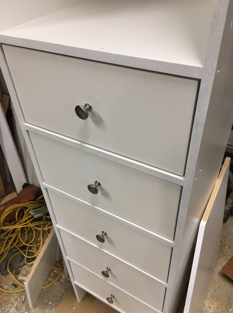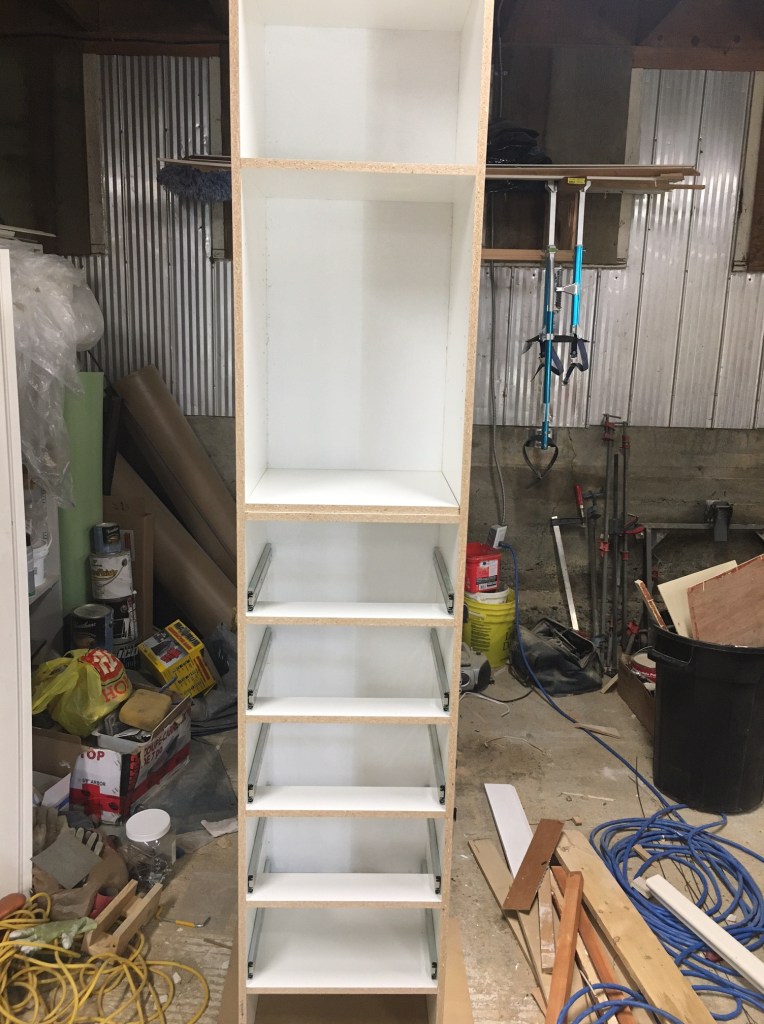 It took me a couple of days to build it and paint it, and half a day to install everything. To save time and material on the upper cabinet, I built the upper part “on site” using the side panels and interior shelves to hold everything together. But the bottom section was a pre-made plywood drawer box.